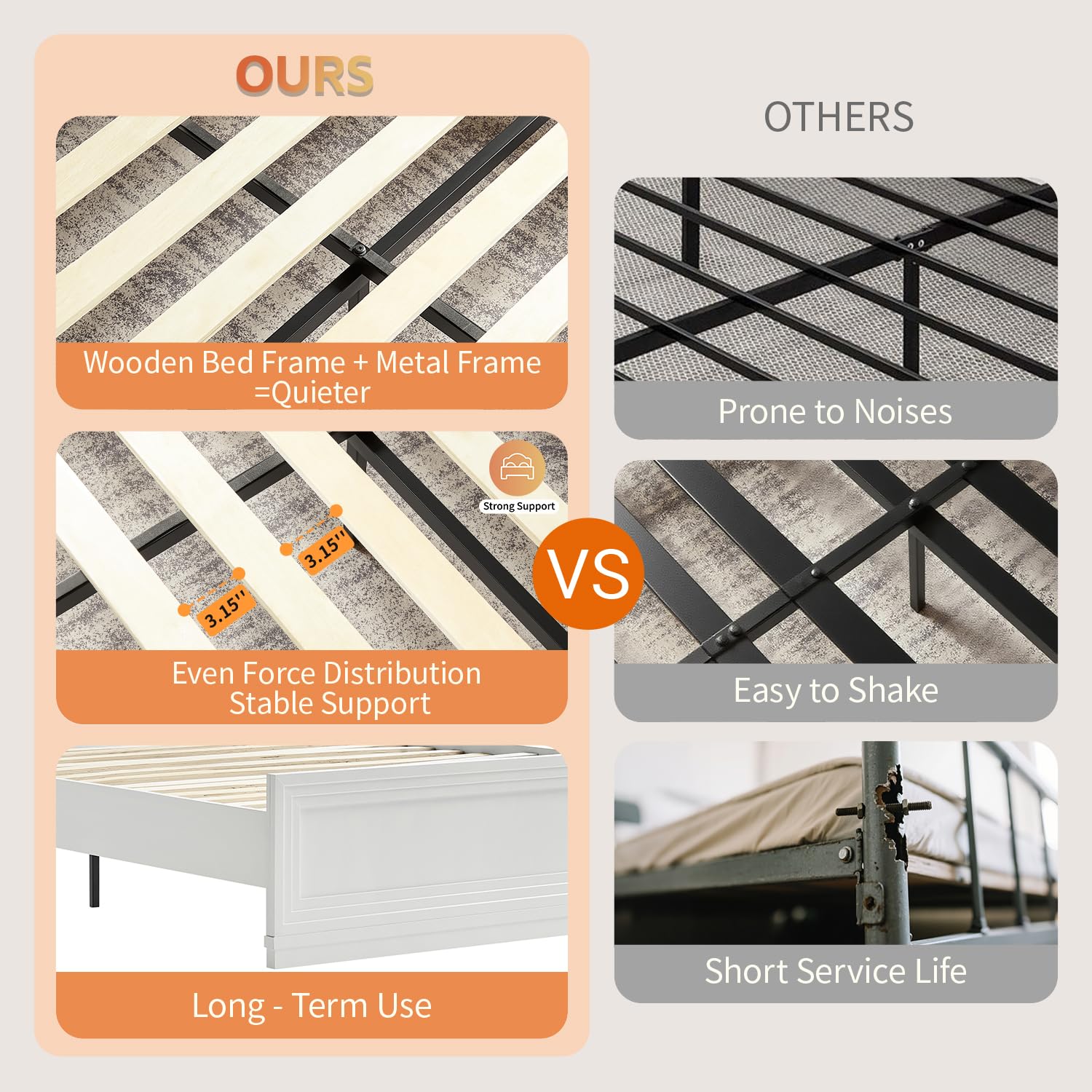 - NOISE-FREE SLEEP: Combining evenly distributed wooden and metal slats, this bed frame with headboard reduces noise far better than traditional all-iron frames. We’ve added mute sponge strips to the steel frame to avoid friction between metal parts, effectively eliminating rattles. Plus, scratch-resistant foot pads protect floors and further reduce noise.