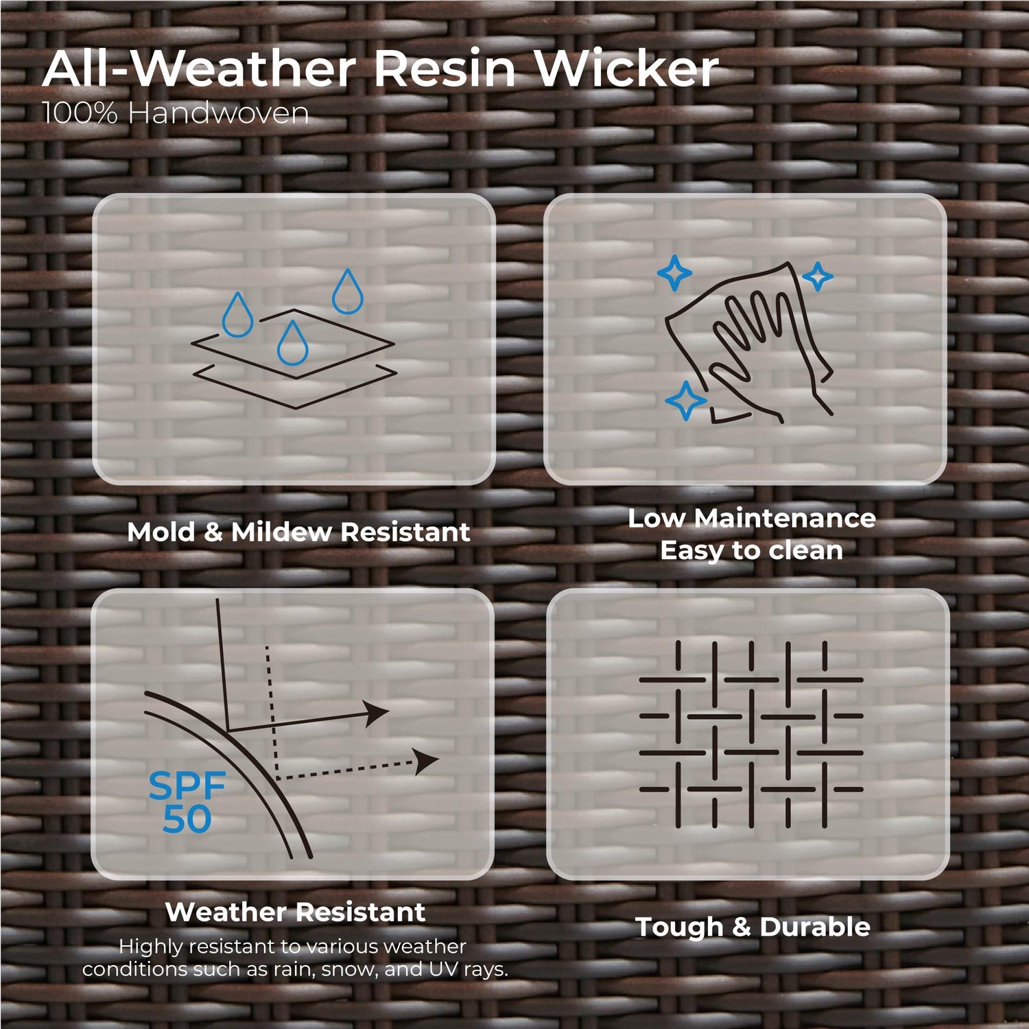 - Five Pieces Set with a Modern Farmhouse Vibe – Crafted with meticulous attention to detail, this patio conversation set is a seamless blend of rustic charm and contemporary design. It boasts all-weather resin wicker intricately handwoven around a sturdy e-coated steel frame, ensuring both durability and elegance.