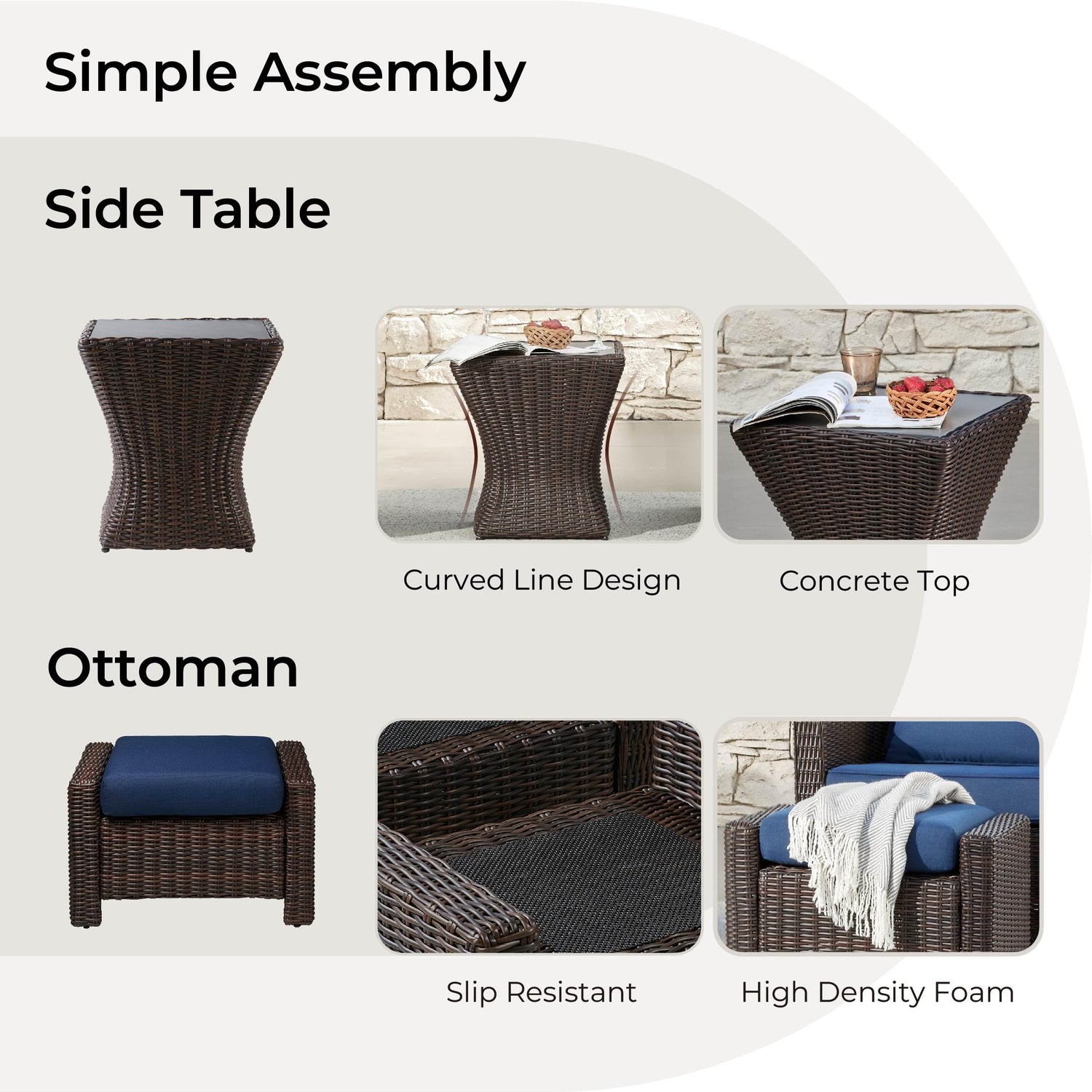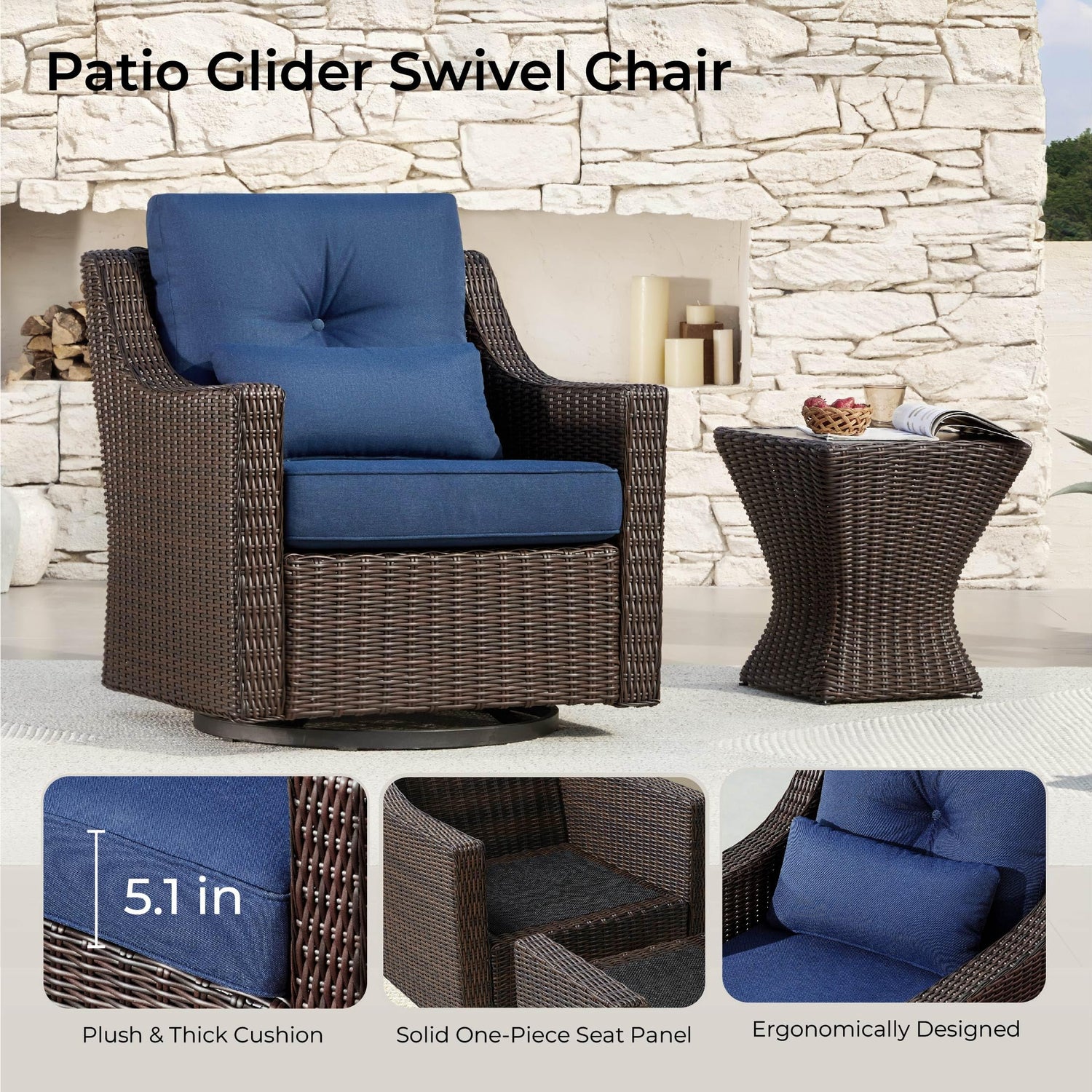 CHITA 5 Pieces Wicker Patio Furniture Set, Outdoor Conversation Set with 2 Pieces Rocking Swivel Chairs, 2 Pieces Ottomans and Side Table, Blue Cushions with Chestnut Wicker