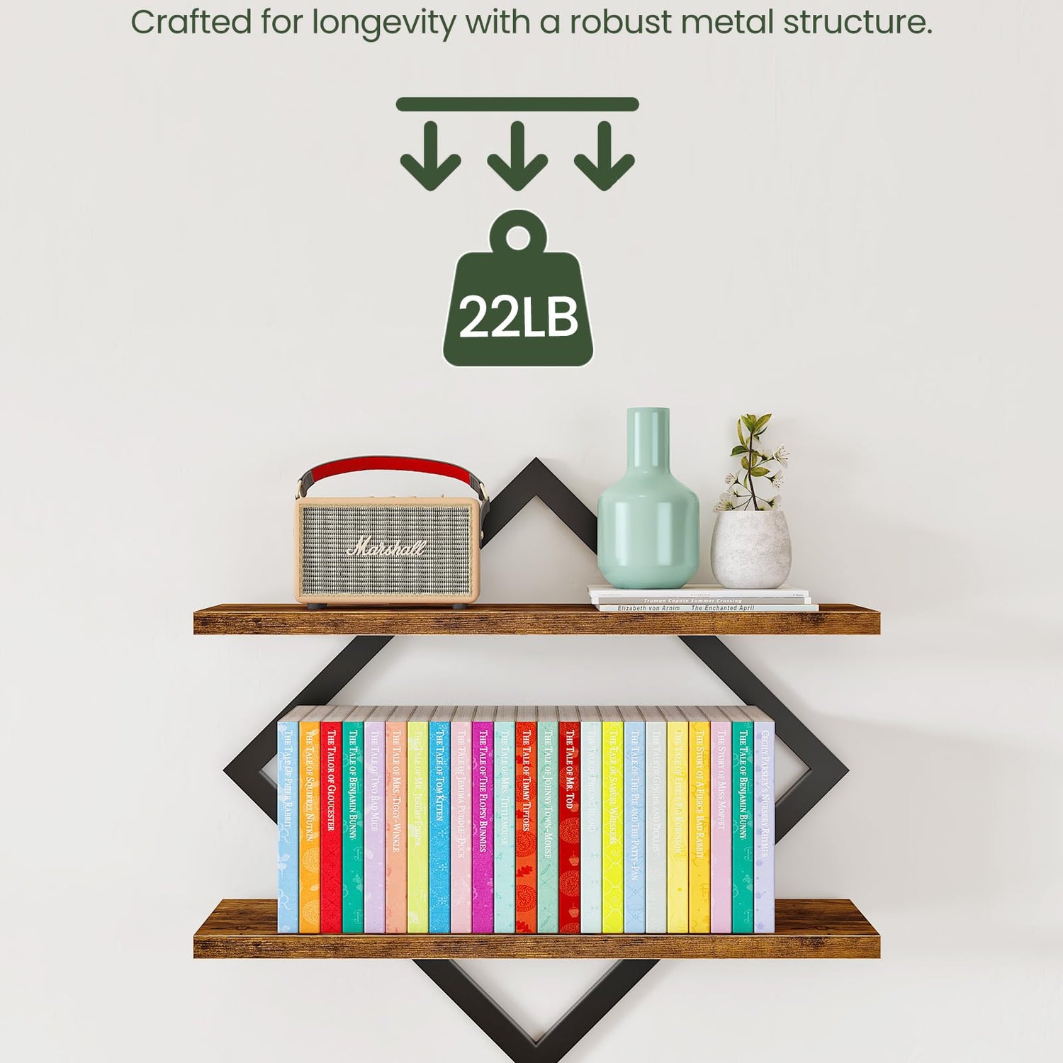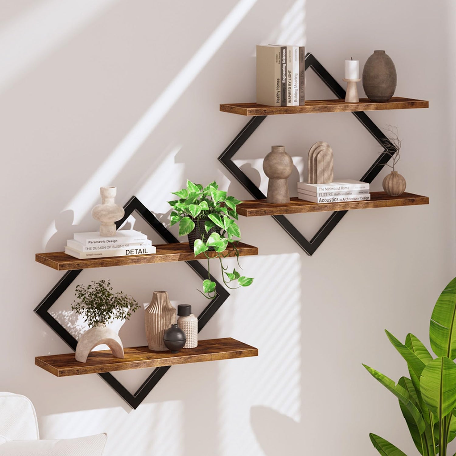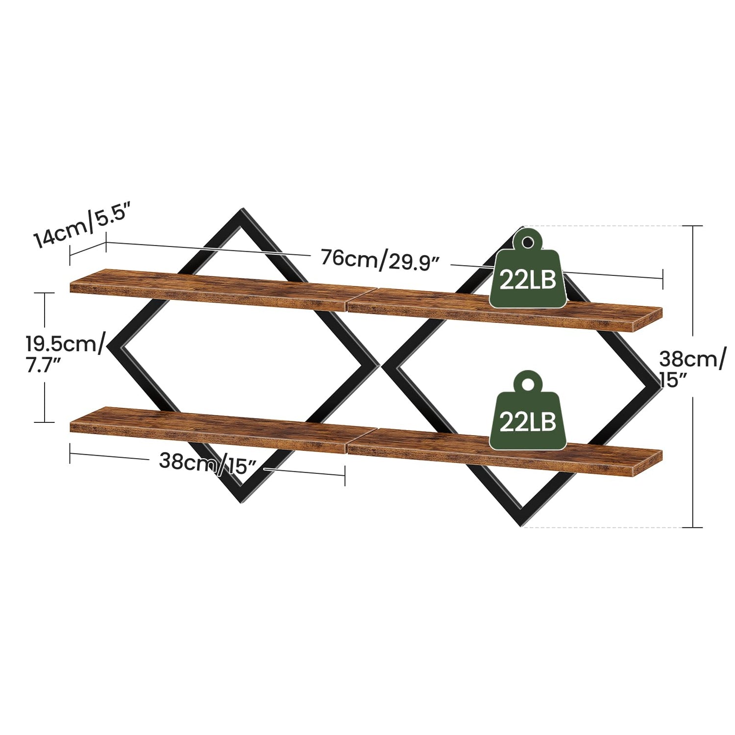 - Chic Diamond Design, A New Space Vibe: This 2-piece floating shelves set, with its diamond-shaped iron tubes and double-tier design, offers a fresh visual delight for your home space. Its vintage industrial hue effortlessly complements your indoor decor