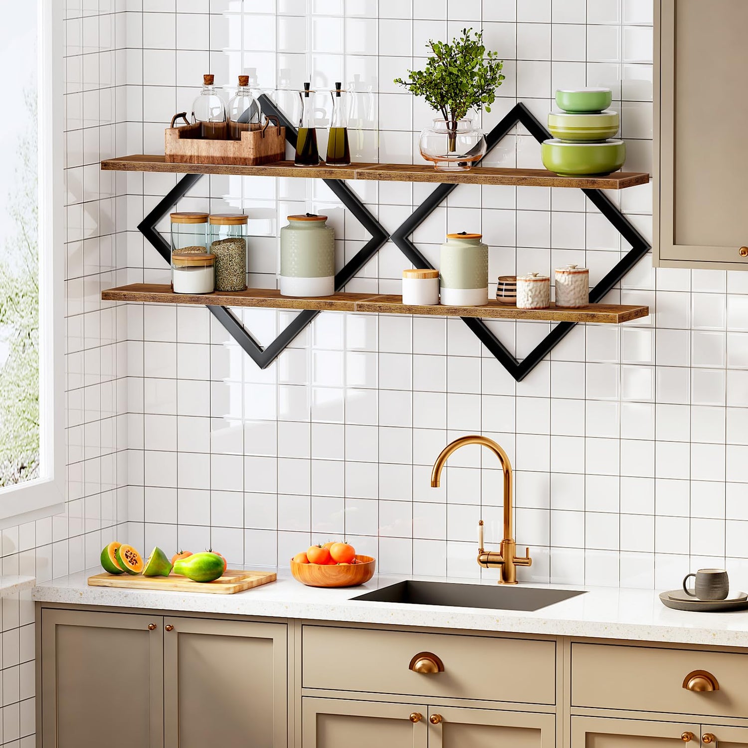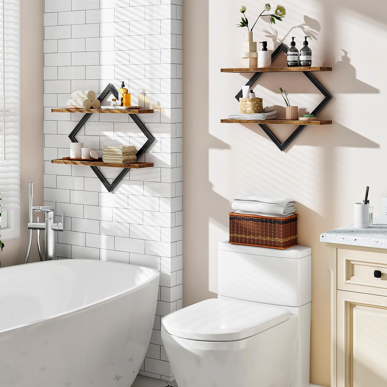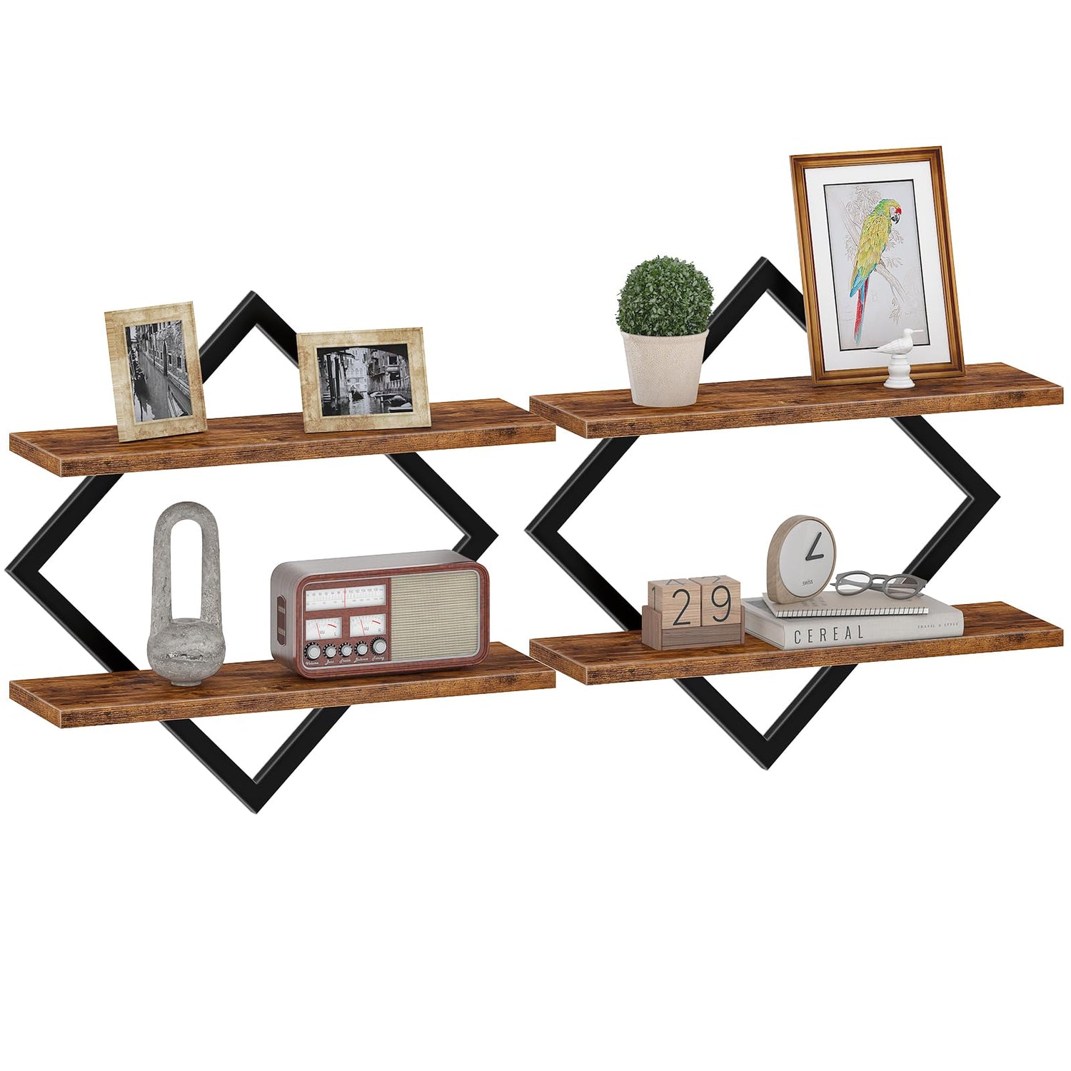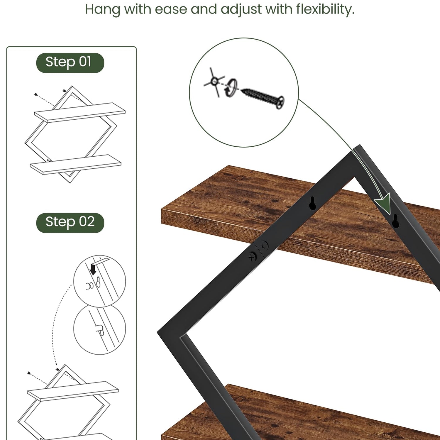 - Chic Diamond Design, A New Space Vibe: This 2-piece floating shelves set, with its diamond-shaped iron tubes and double-tier design, offers a fresh visual delight for your home space. Its vintage industrial hue effortlessly complements your indoor decor