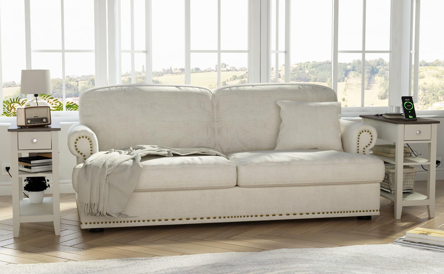 ChooChoo Farmhouse End Table with Charging Station, Narrow Side Table Living Room with USB Ports & Power Outlets and Hidden Drawer,White and Brown