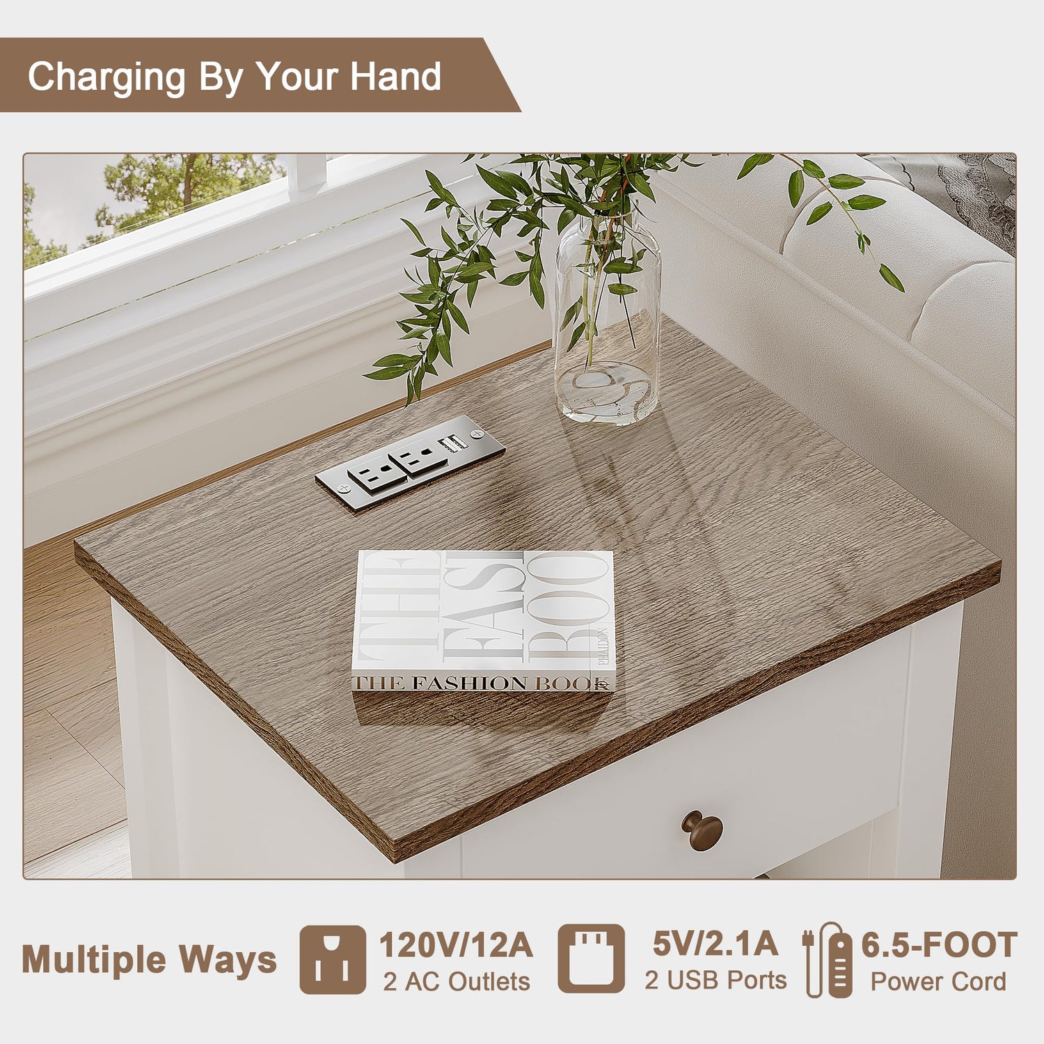 ChooChoo Farmhouse Nightstand Set of 2,Night Stand with Charging Station, Wooden Top Bedside End Table with Drawer and Storage Space for Bedroom, White