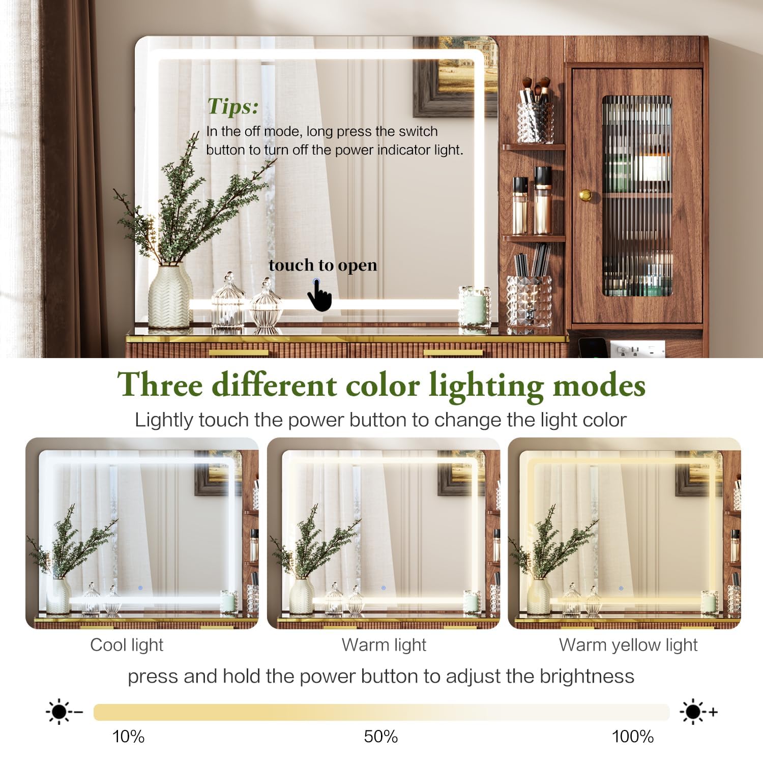- 【3-Color LED Light】The vanity desk features a specially shaped dimmable lighting mirror with 3 different LED lighting colors, including natural, warm and cool light, for a variety of indoor lighting and environments to optimize your makeup
