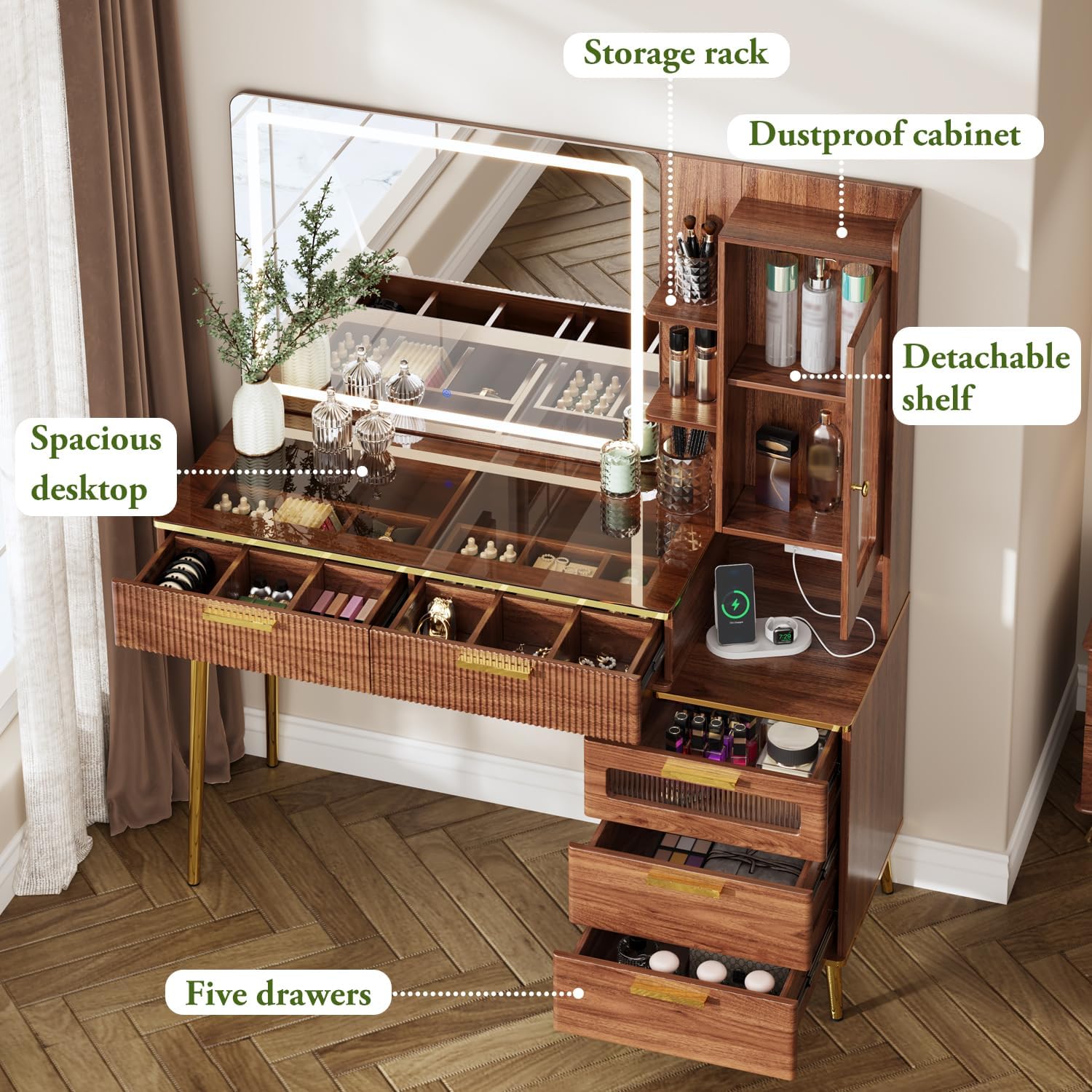 Chrangmay 47.24" Big Modern Vanity Desk with Mirror and Lights,Makeup Vanity Desk with 5 Drawers and Storage Shelves & Power Outlet,Dressing Table with Glass Top, Brown