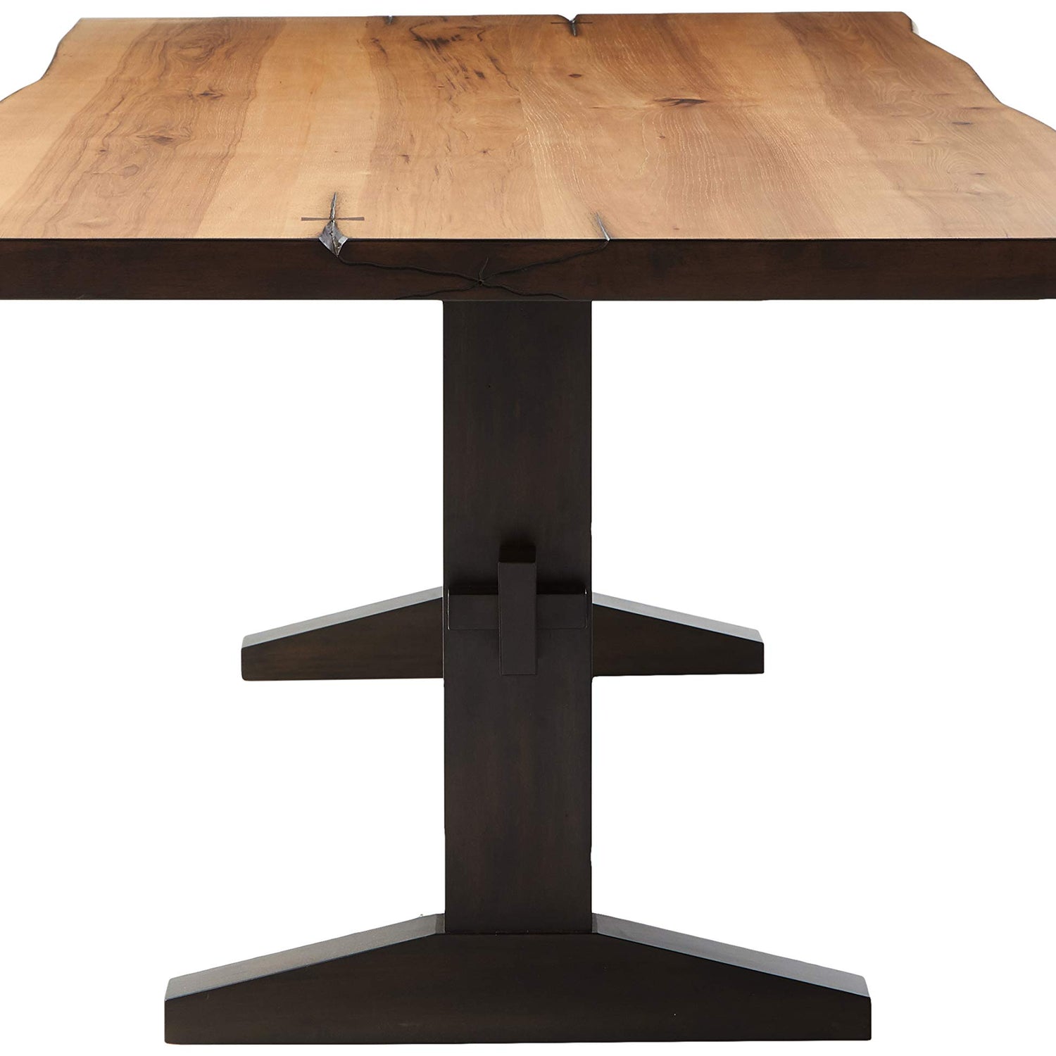 Details: Rugged edges create a sense of rustic character for this wood dining table. Perfect for a family of six, the table measures 90 inches across and can easily accommodate a guest or two. The rectangular tabletop features a warm and inviting natural honey finish with wonderfully warm undertones. The base of the table is inspired by a classic trestle. In a smokey black finish, it adds the ideal dose of contrast and dimensionality to your dining room.
