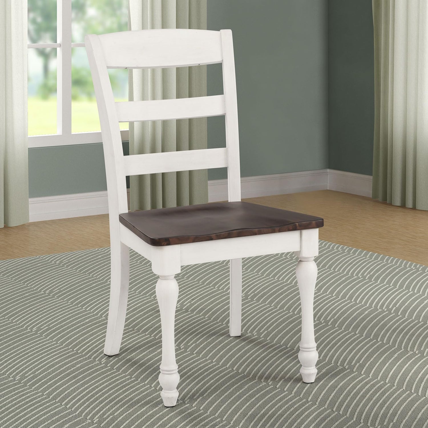 Details: Bringing farmhouse charm to any setting, these ladder back chairs feature contoured scooped seats, classic turned legs, and a warm pairing of dark cocoa seating with a coastal white finish. Built with lasting strength from quality wood construction, the design includes tapered back legs and floor-safe plastic glides. The straight profiles, tall backrests, and non-upholstered chairs format make them ideal for daily use and easy care in any dining room or kitchen furniture setup. This set of 2 dining chairs offers versatile use as armless side chairs, blending beautifully into farmhouse style and modern home furnishing.