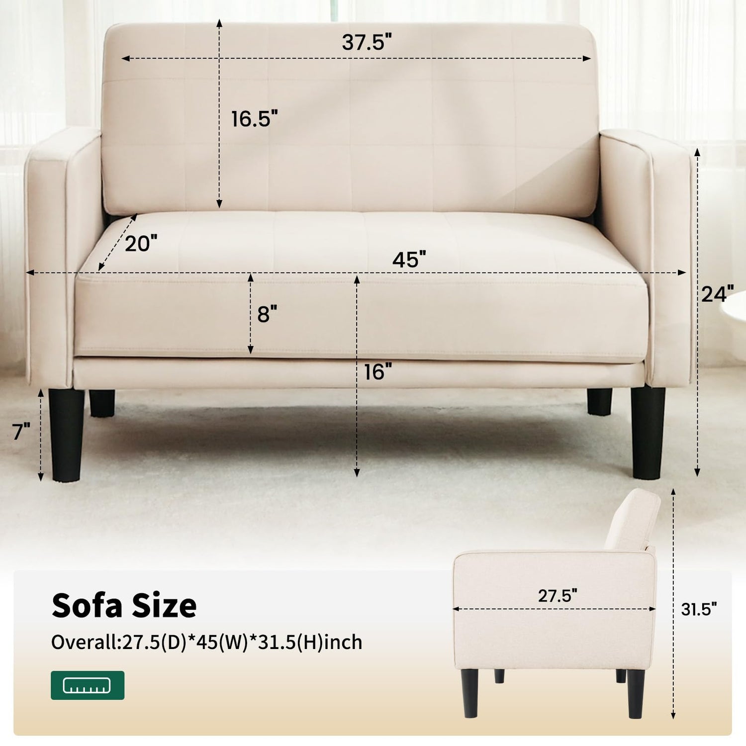 • 【Modern & Space-Saving Sofa Design】This stylish 45" loveseat features a sleek, minimalist design with overall dimensions of 27.5"(D) x 45"(W) x 31.5"(H). Perfectly suited for small living spaces, offices, and reception areas, it offers both comfort and functionality without compromising on style.