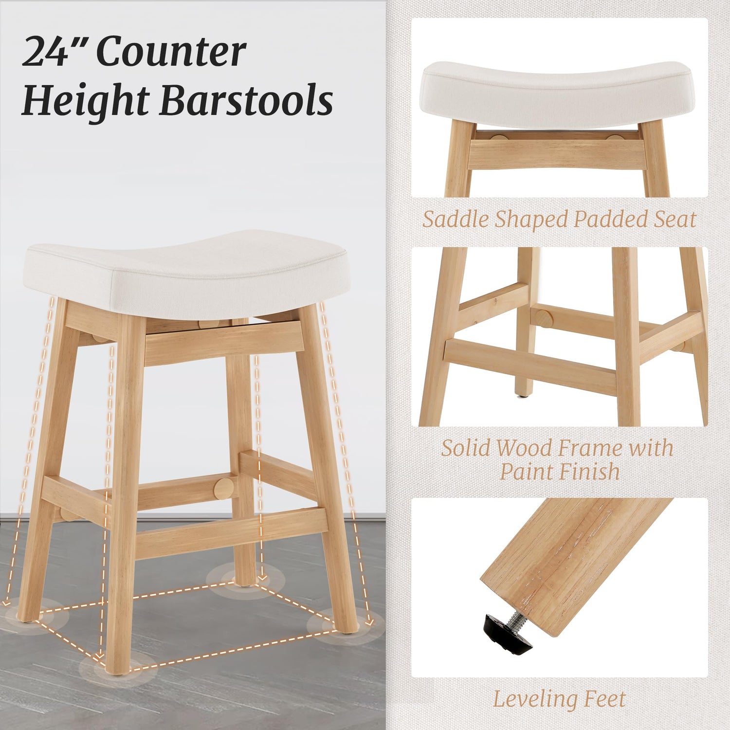 Cozyman Bar Stools Set of 3, Barstools with Sturdy Wood Legs, Saddle Seat Counter Height Bar Stools for Kitchen Counter, Bar, Dining, 24 Inch Farmhouse Counter Stools, Beige Fabric