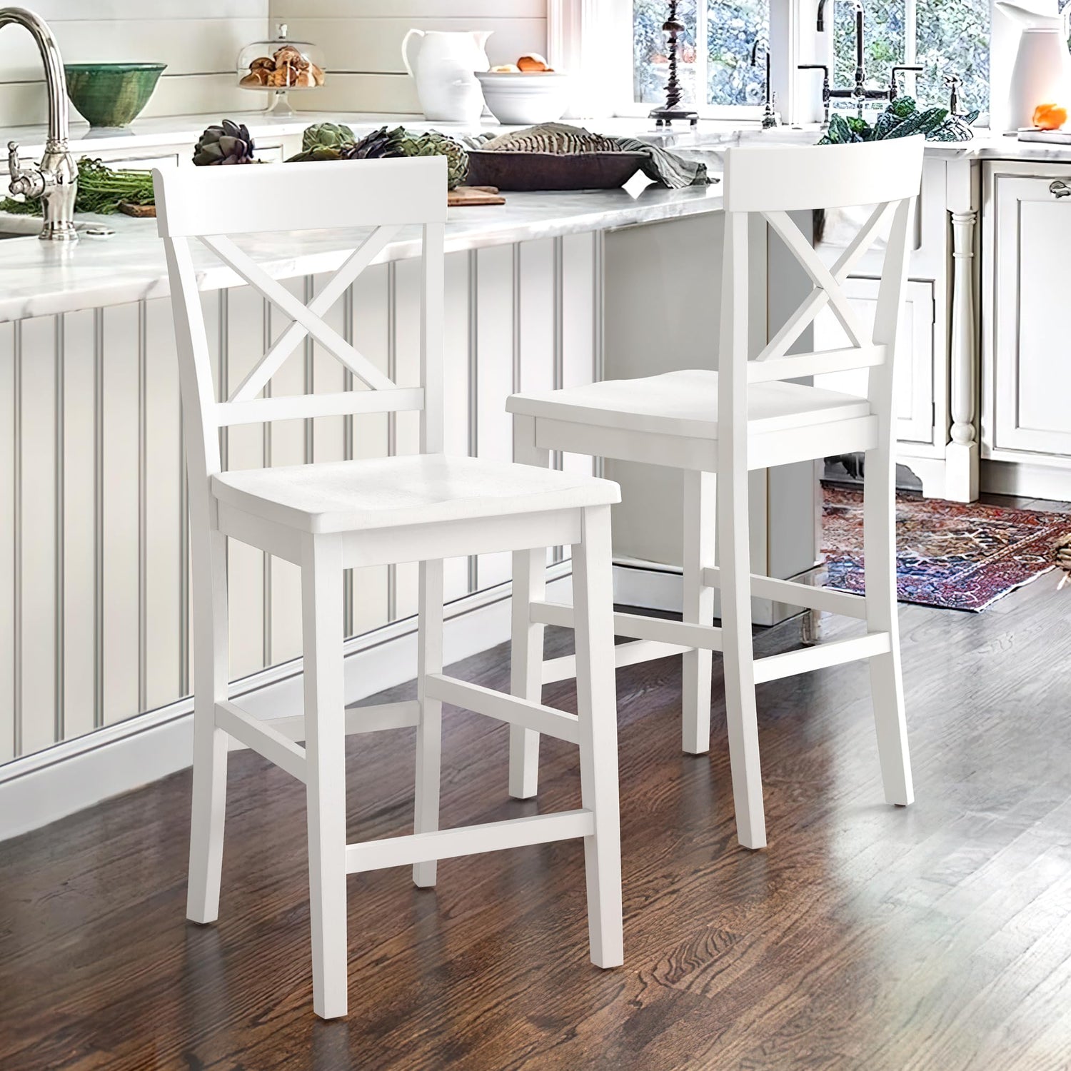 Cozyman Counter Height Bar Stools Set of 2, 24" H Wooden Counter Stools with Back and Footrest, X-Back Farmhouse Barstools for Kitchen Island, Home Bar, White