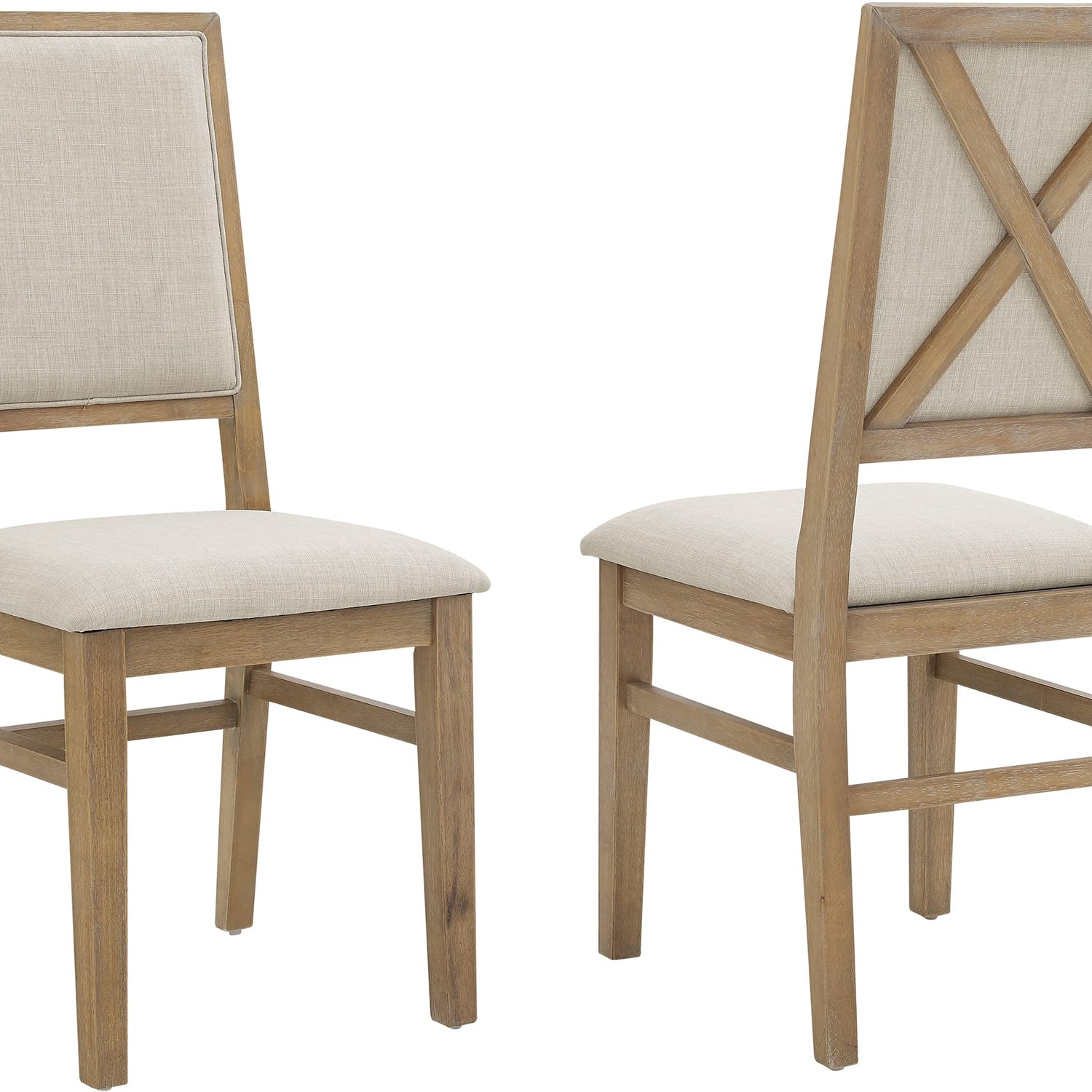 Details: The rustic elegance of the Joanna 2-Piece Upholstered Chair Set adds farmhouse charm to your kitchen or dining room. Along with the upholstered back and seat, this chair set features a unique wooden X design across the back. The Joanna 2-Piece Upholstered Chair Set brings character and durable comfort to a variety of dining options.