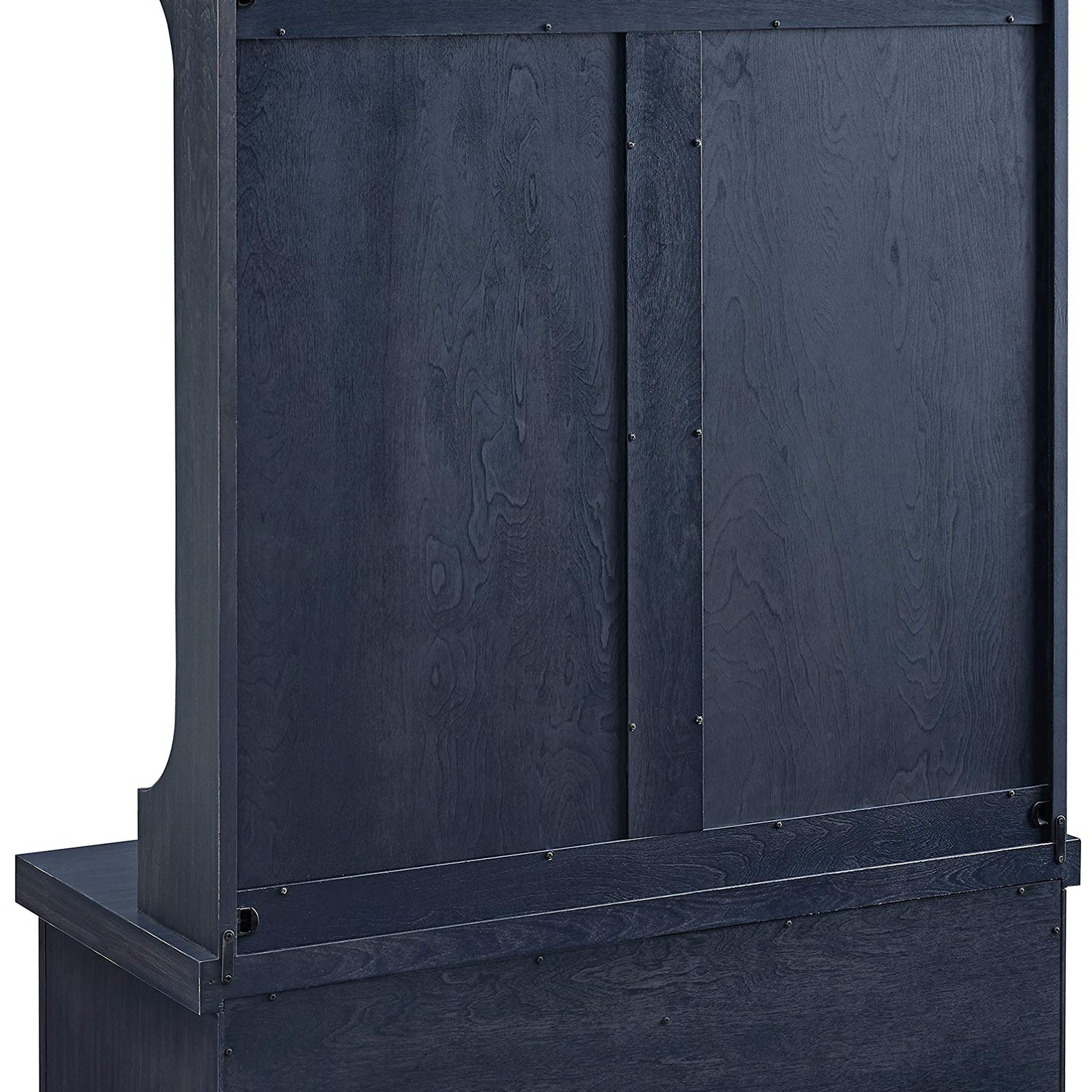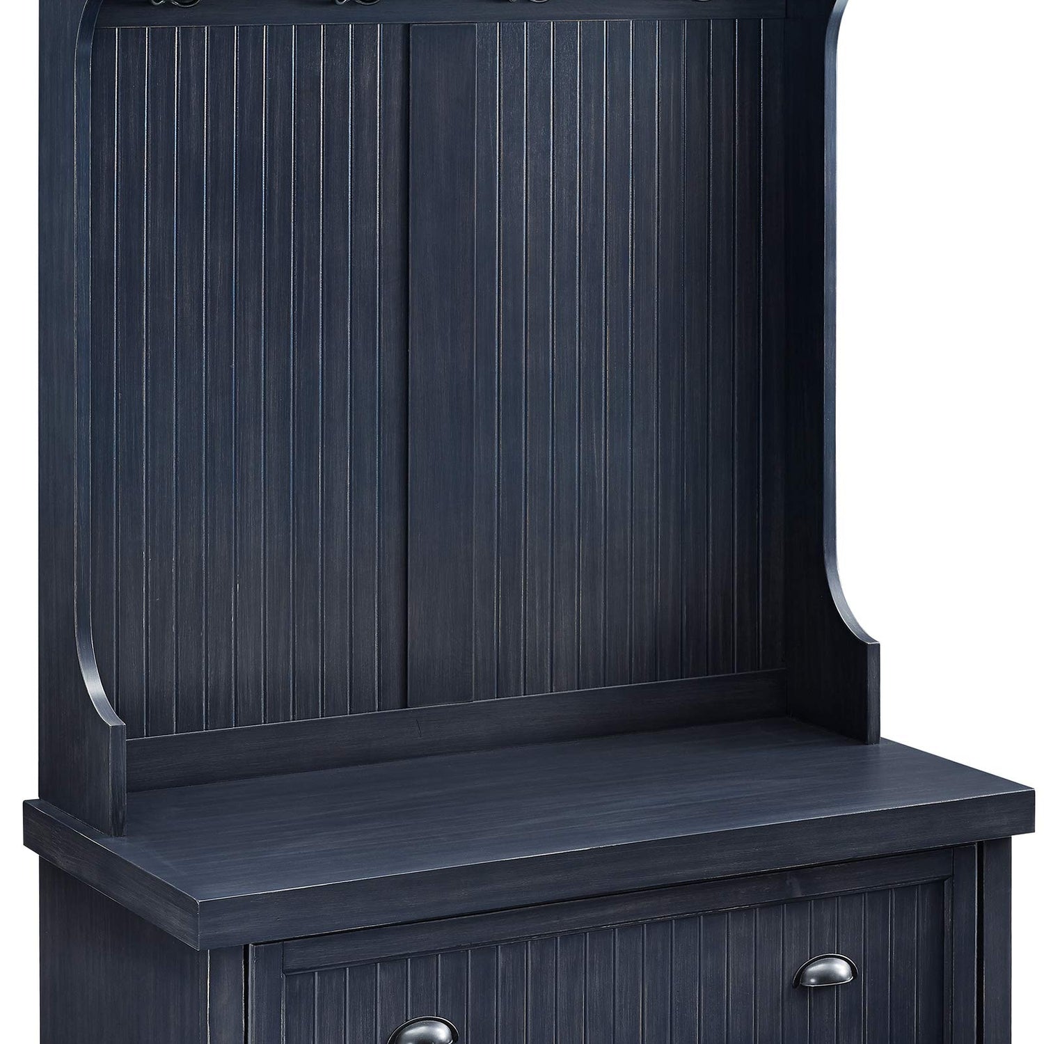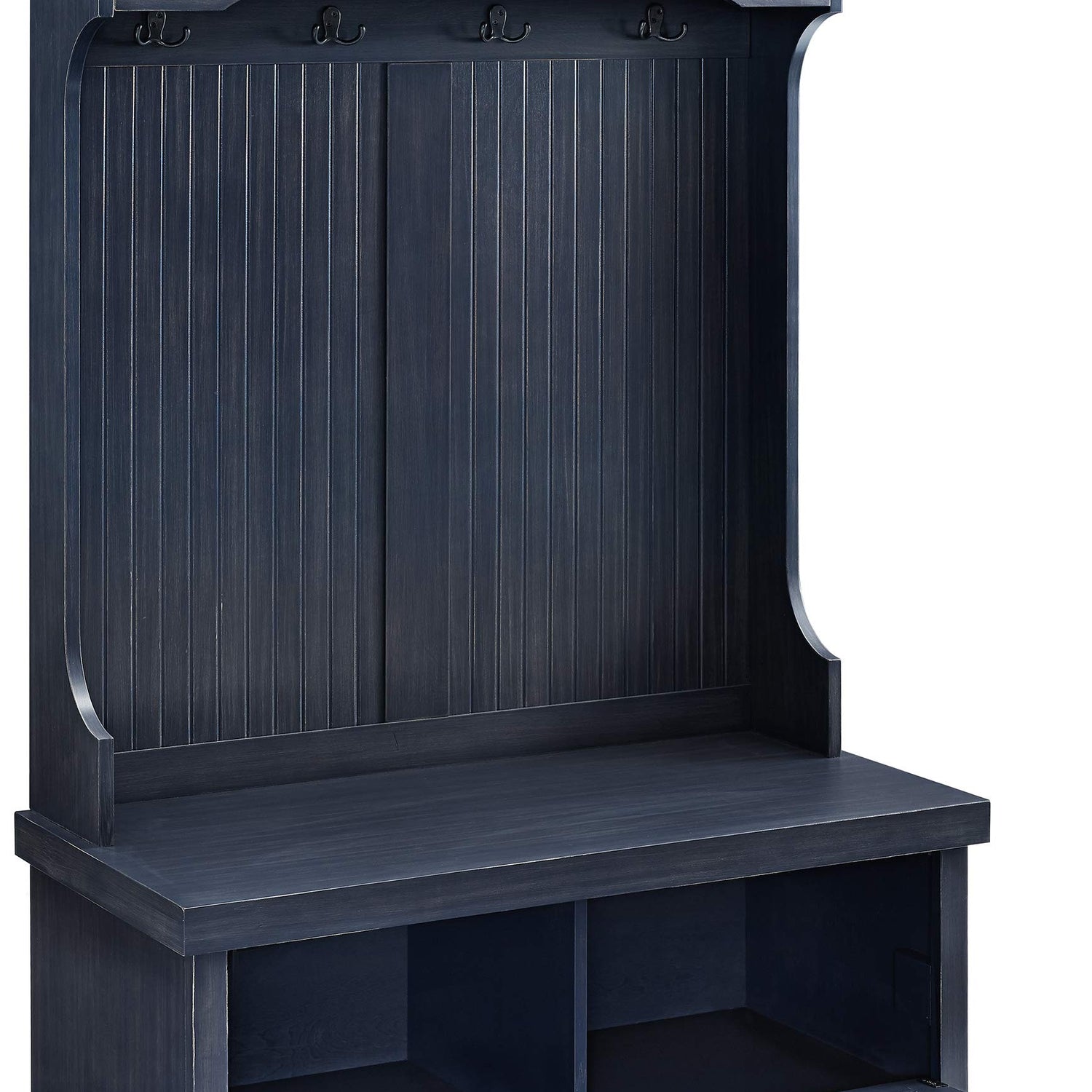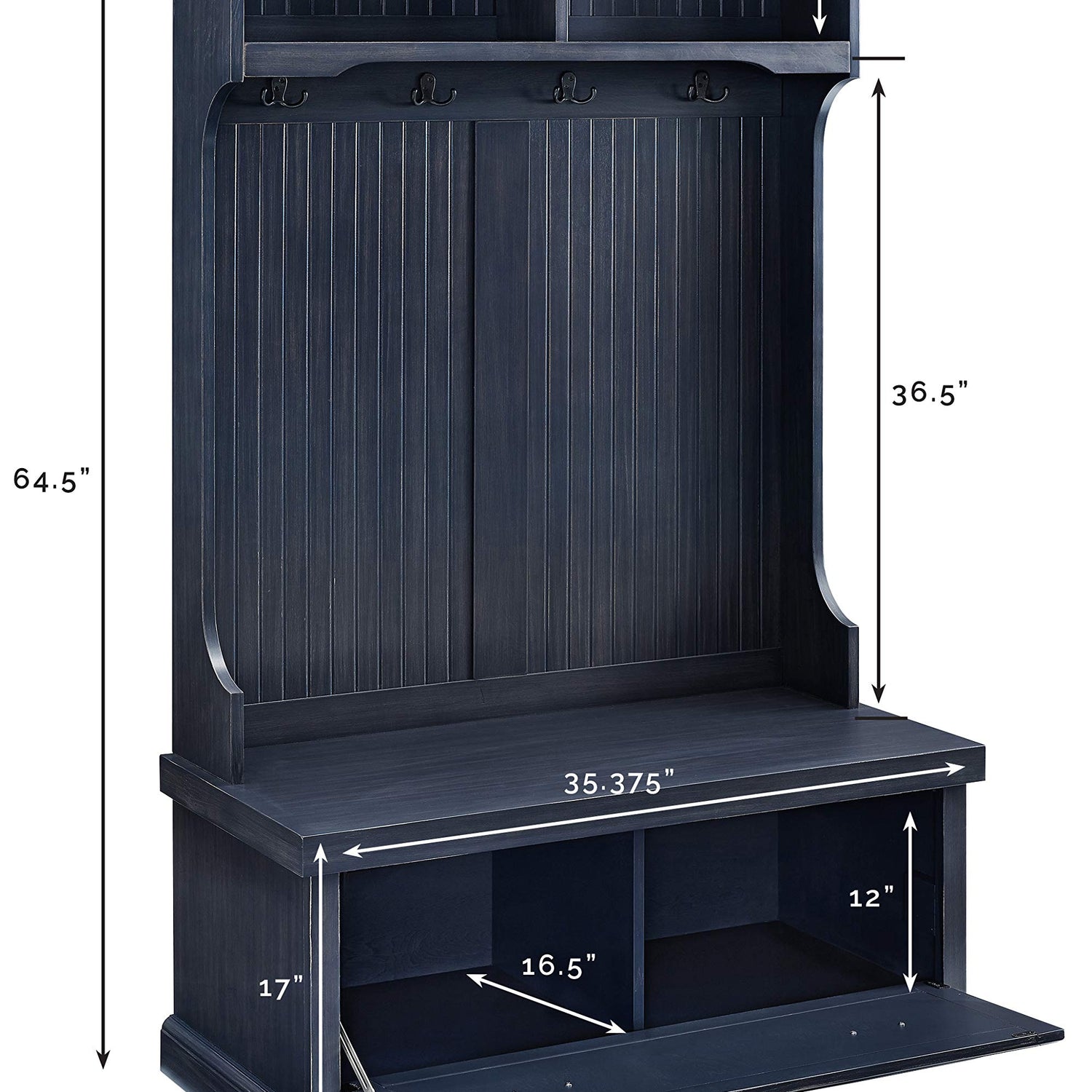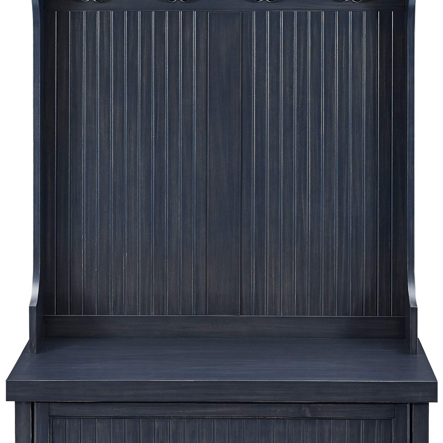- COASTAL STYLE: This hall tree, featuring a hand-rubbed, distressed navy finish and beadboard paneling, brings beachy vibes to your entryway. The antique gold-finished metal hardware enhances its coastal charm.