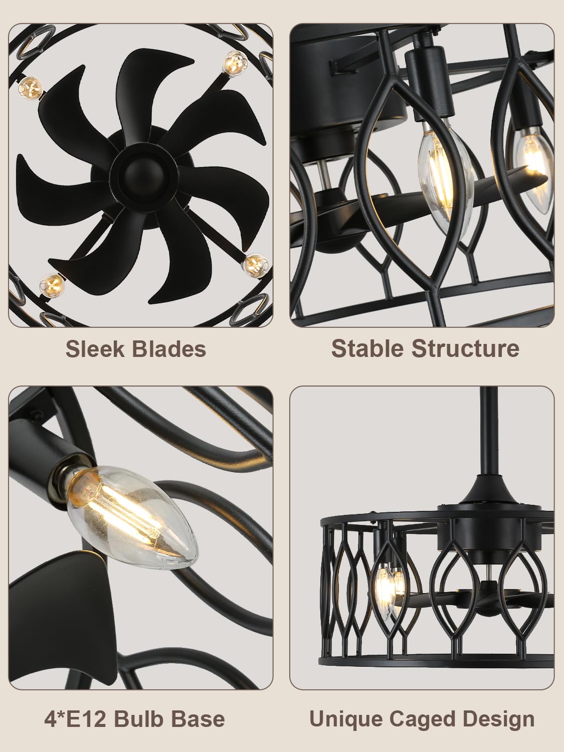 • Bladeless Ceiling Fan:This 19-inch caged ceiling fan with light features 4*E12 light bases (bulbs not included) and wood caged frame, adding a rustic touch to rooms with limited space. It is ideal for kitchen, bedroom, dining room, and living room.
