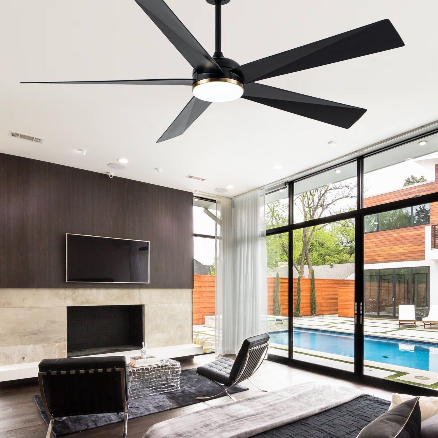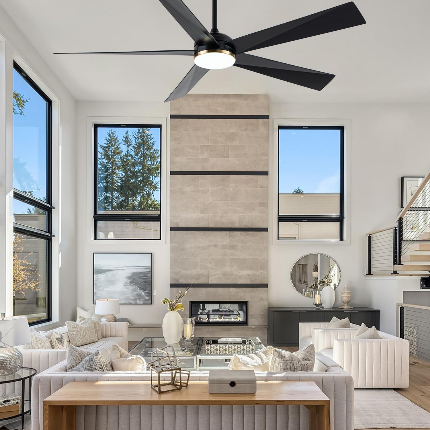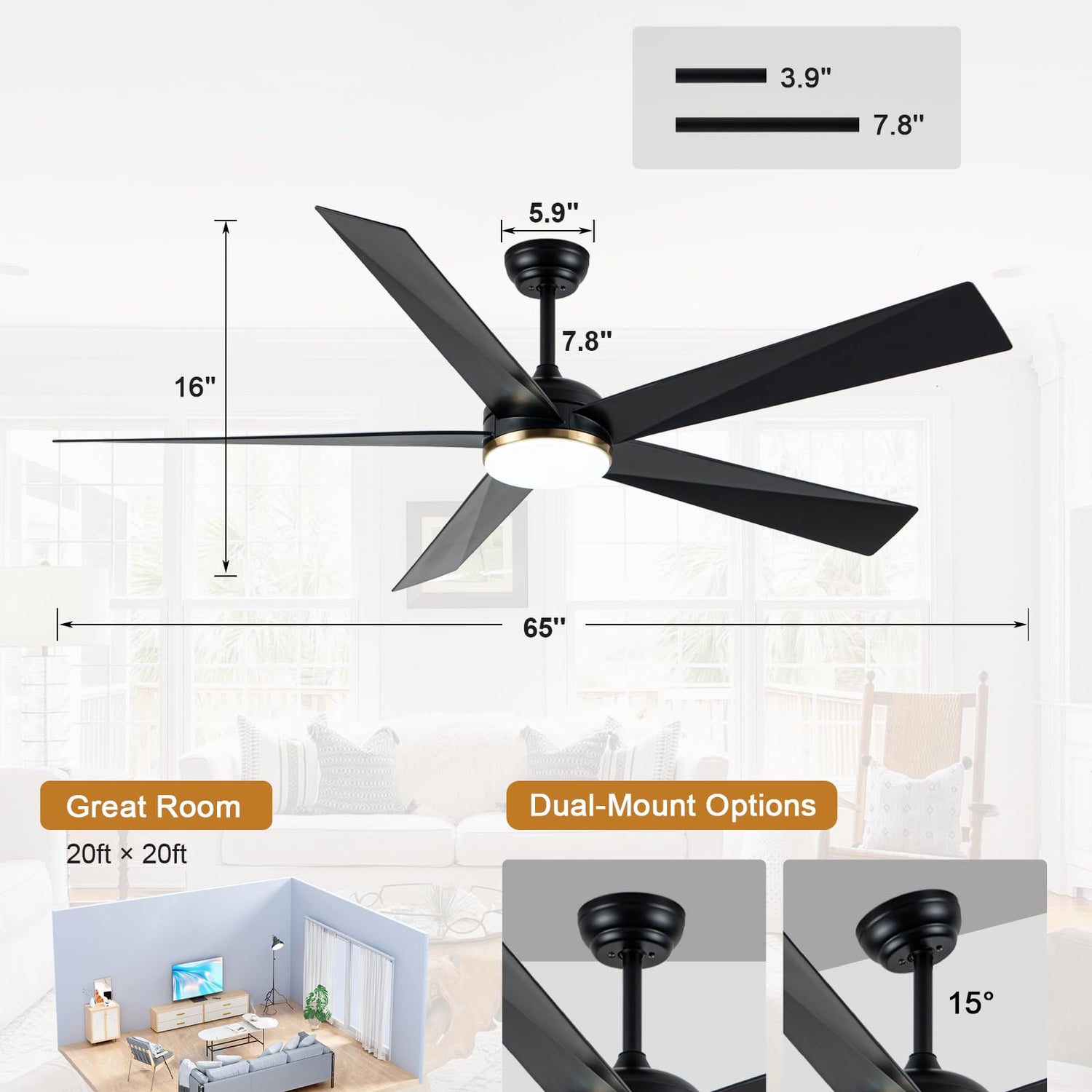 - 65-Inch Ceiling Fan: This modern ceiling fan features 5 pure black blades, making it perfect for modern or farmhouse-style environments. With a diameter of 65 inches, it is suitable for 20 feet by 20 feet rooms, ideal for living rooms, large rooms, covered patios, and porches.