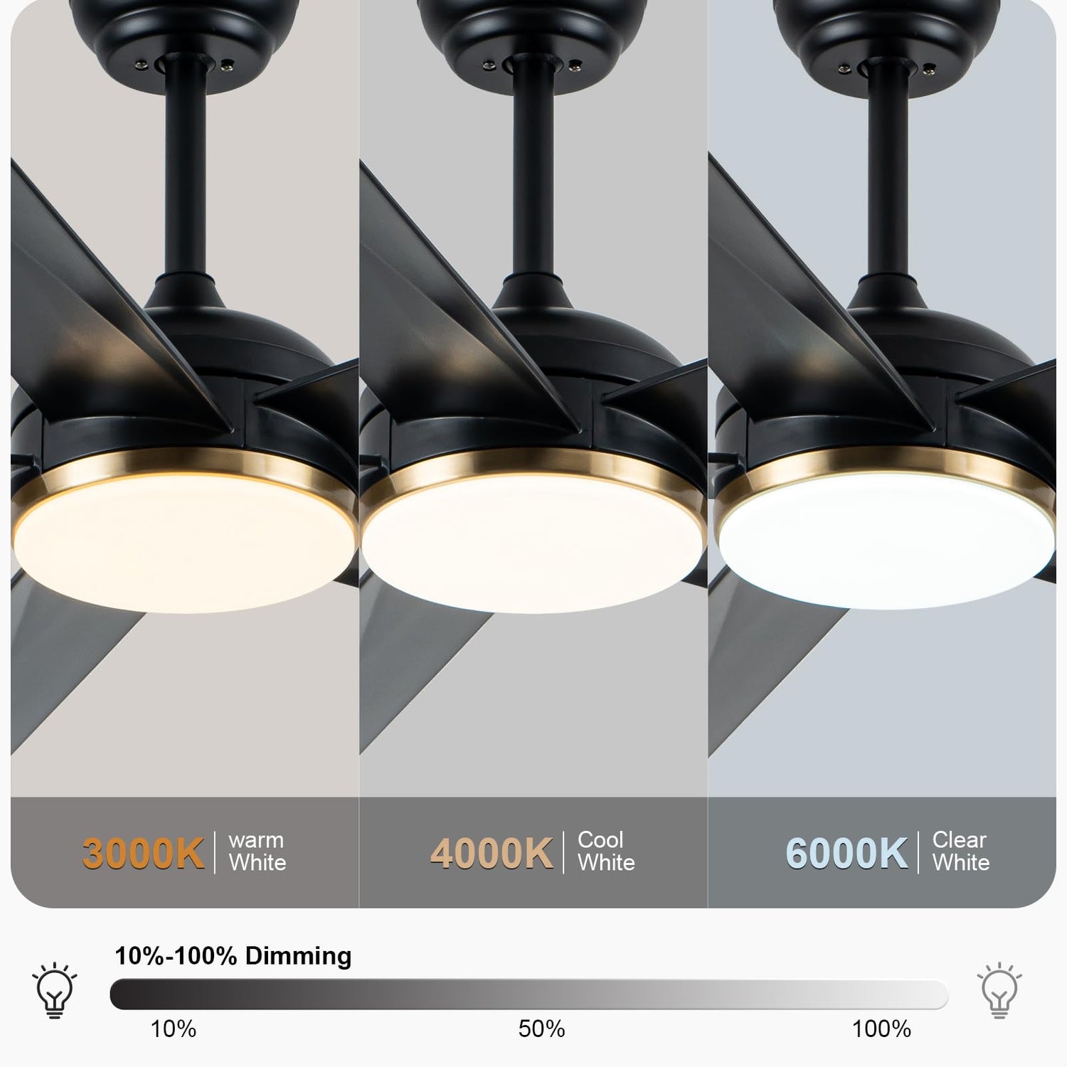 - Dimmable and Memory Function: The high-brightness 1760 lumens LED light provides ample illumination while saving energy! It offers 3 color temperature choices: 3000K warm white, 4500K natural white, and 6500K cool white. You can also adjust the brightness of the light to create your desired ambiance. The black fan also comes with a memory function that remembers your last light setting when you turn it off and on after a 10-second wait.