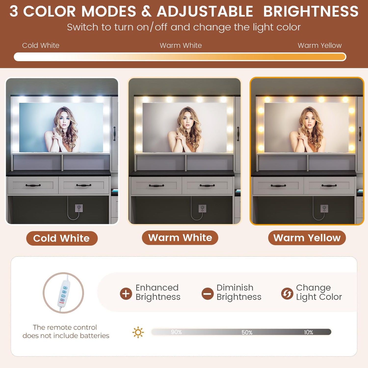 - [Vanity Desk with 3 Lighting Modes & Brightness Adjustable Lights]: Don't have comfortable lighting for makeup? Look here! The makeup vanity desk is equipped with a large mirror and 10 variable brightness LED bulbs , offering 3 different color modes (warm white, cool white and warm yellow) to meet your various needs on different occasions. When the vanity lights are turned on, you can enjoy a star-like makeup experience!