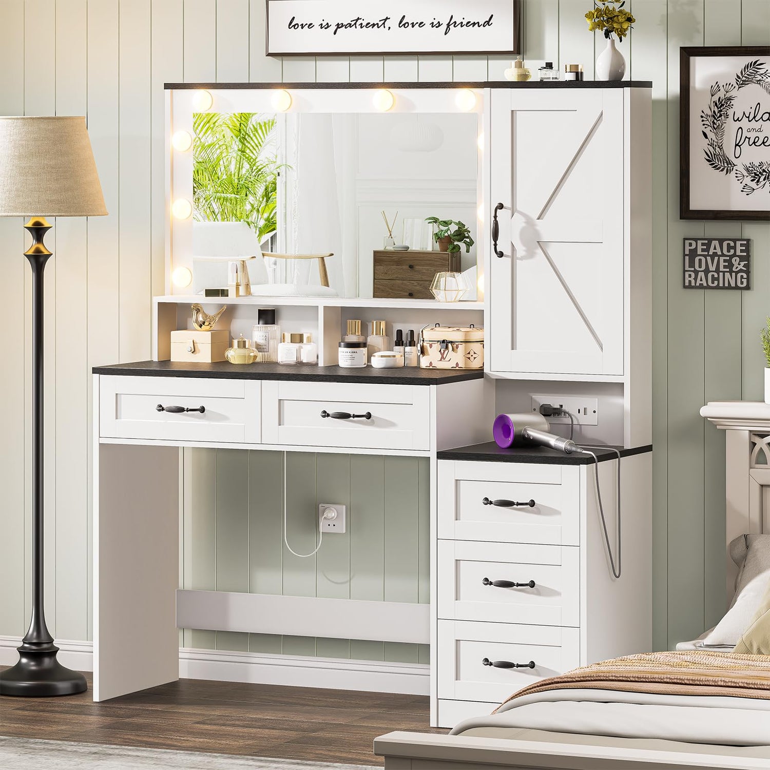 - [Farmhouse Makeup Vanity with Ample Storage Space]: Are you still troubled by the messy pile of cosmetics on the table? Our vanity desk has 5 large capacity drawers that can store various cosmetics, jewelry, and small items. There is a row of open storage shelf under the mirror for commonly used skincare products. Behind the cabinet door on the right side hides an adjustable shelf and 9 hooks, so your necklaces and jewelry box can stay private, while maintaining a neat and elegant vanity space