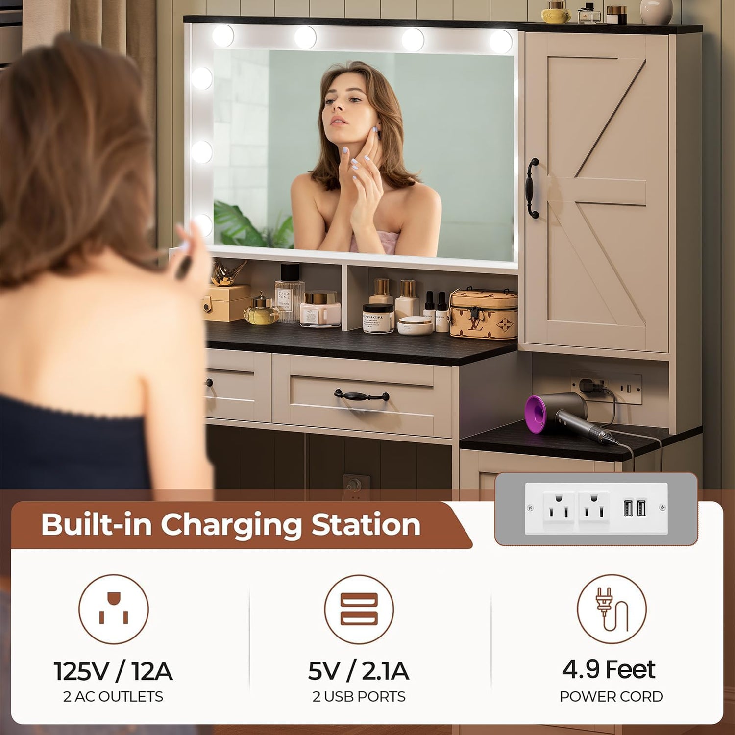 - [Vanity Table with Charging Station]: Want beautiful hair immediately after makeup? This makeup vanity desk will meet your needs, with 2 standard AC outlets and 2 USB ports, you can stand in front of the mirror and use a hair dryer and curling iron for a perfect hairstyle design, while also attaching a selfie stick for a beautiful photo