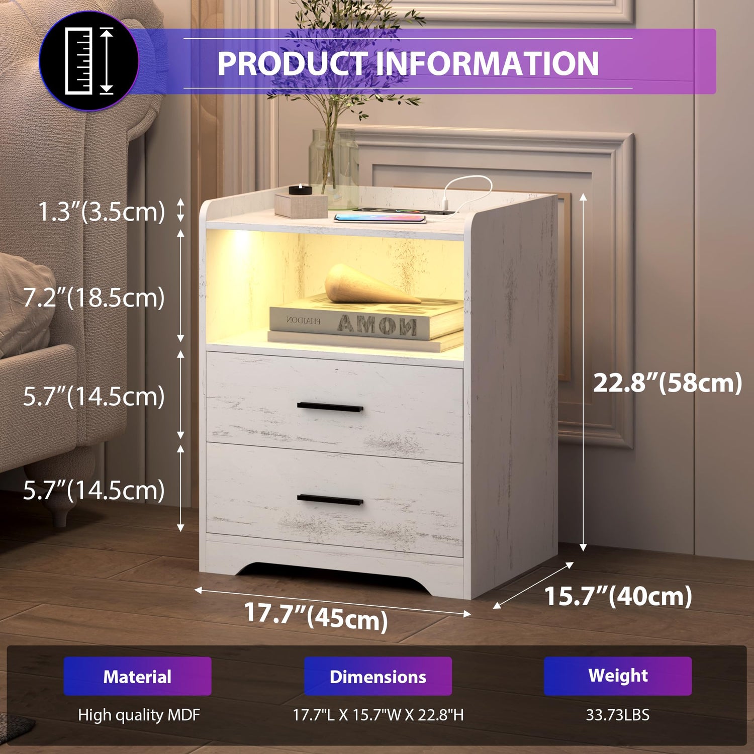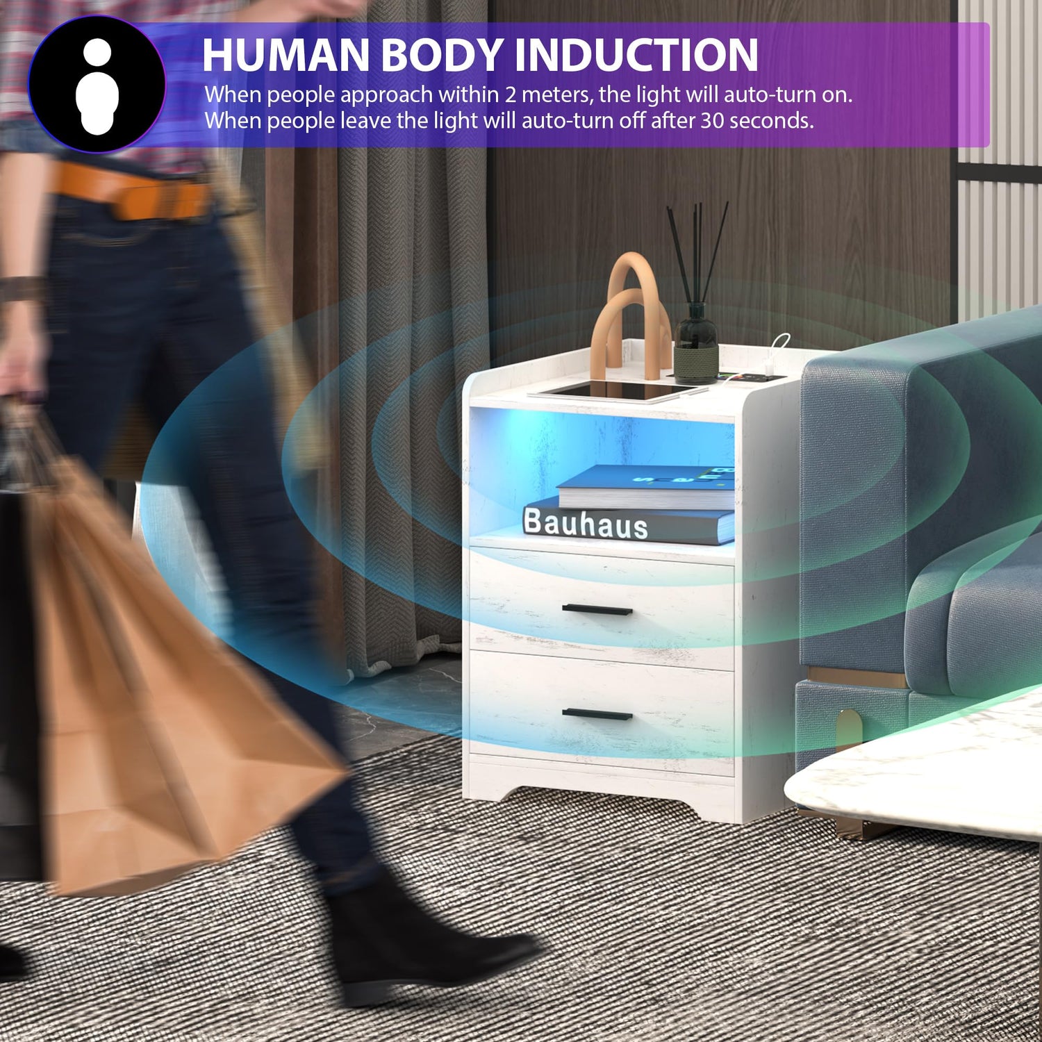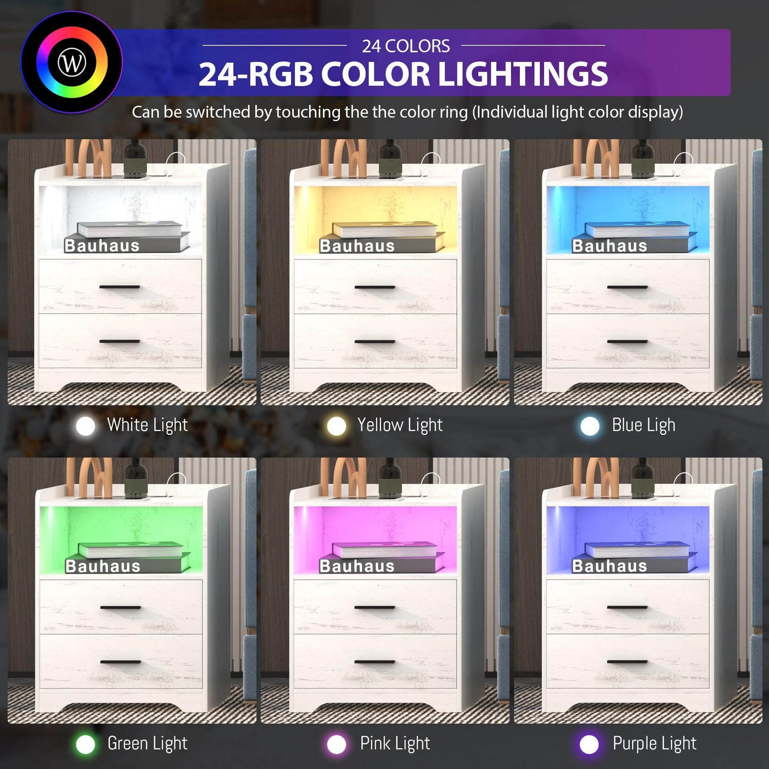 - 【Nightstand with Smart LED Light】the nightstands with 24-color LED lights that can be adjusted in brightness. Choose the color of light by touching the color ring, adjust the brightness by simply long pressing the light button, and convert to white light by touching the "W" button. When the sensor button is turned on, the LED lamp is automatically turned on/off by Human Body Induction within 2-3 meters; making it easier for you at night