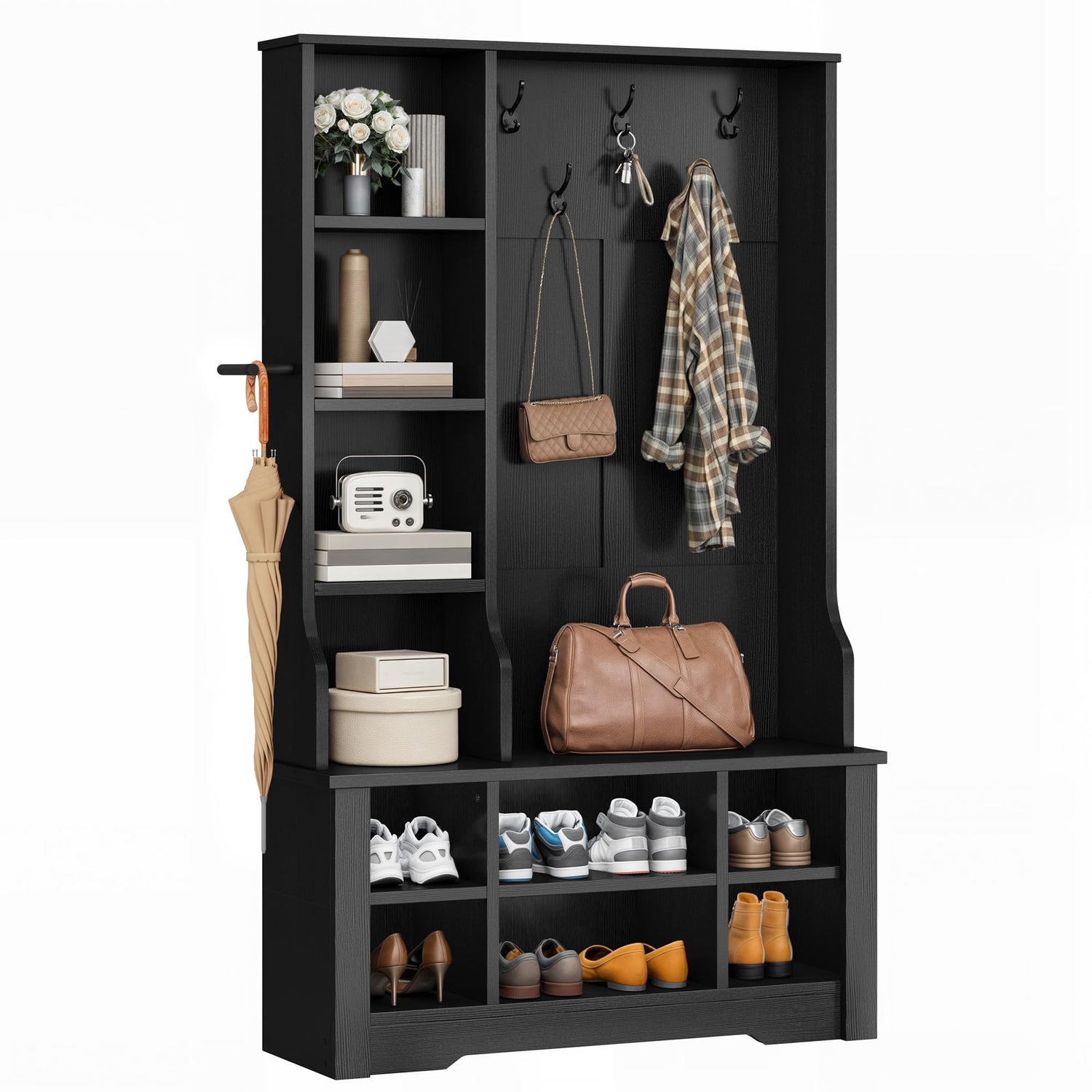 DWVO 39" Hall Tree with Bench and Shoe Storage, 6 Shoe Cubbies & 5 Coat Hooks, 4 Side Storage Cubbies, Entryway Bench with Coat Rack for Entryway Hallway Bedchamber Narrow, Adjustable Shelf (Black)