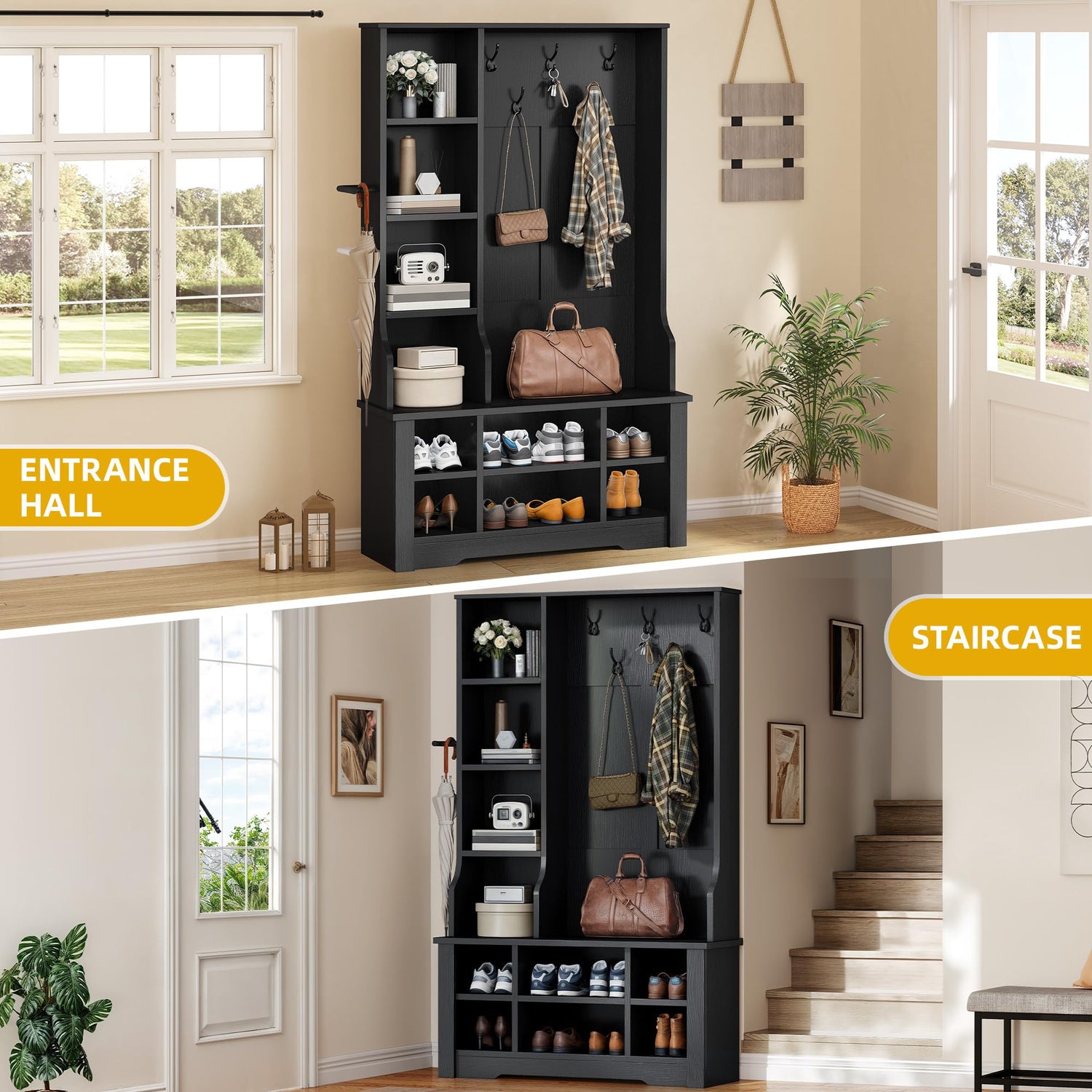 - Multifunctional Storage: This hall tree with bench combines an entryway bench, coat rack, shoe storage, cabinet and umbrella holder. It includes 5 hooks, 3 for long coats, and adjustable shoe compartments for high boots. The side storage is great for books, bags or decor, offering ample space in a compact design