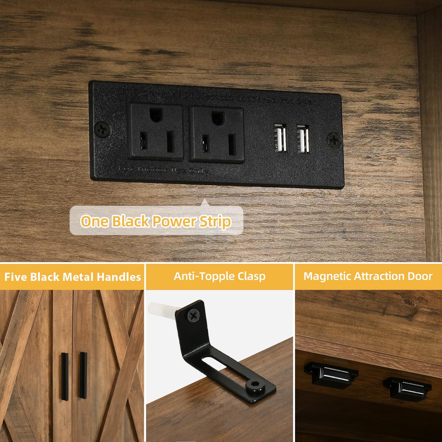 DWVO 67.3" Farmhouse Kitchen Pantry, Storage Cabinet Baker Rack with Power Outlet, Freestanding Hutch with Barn Door & Drawer, Buffet Sideboard with Microwave Stand for Dining Room, Rustic Brown