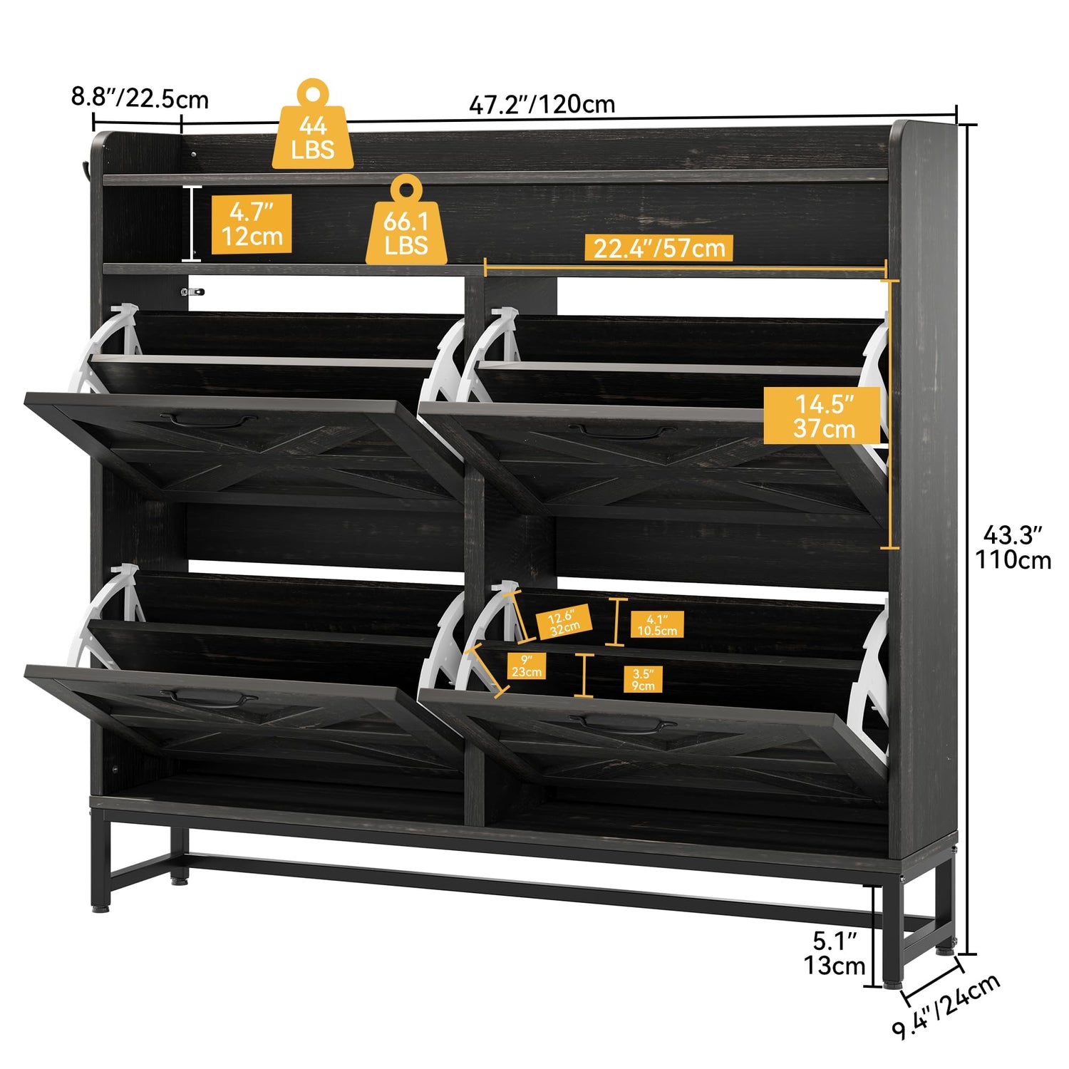 • Ample storage space: This cabinet has a generous capacity of up to 24 pairs of shoes, helping to keep your entryway or living room organized and clutter-free. In addition, the open shelves provide versatile display opportunities for ornaments. opportunities for ornaments