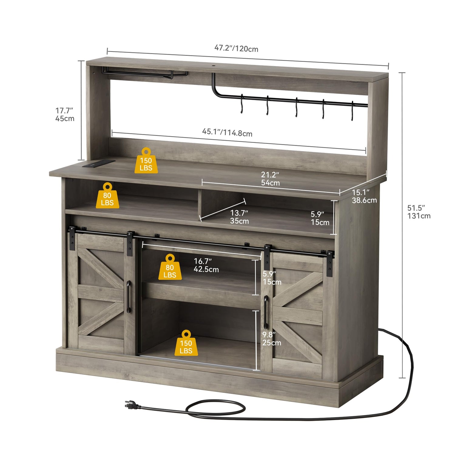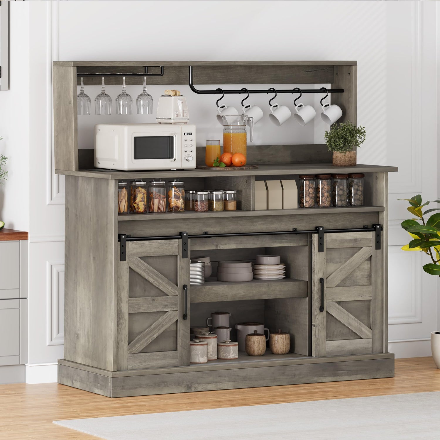 Details: Elevate your kitchen or dining space with this multifunctional farmhouse-style coffee bar cabinet, expertly designed to provide versatile storage and modern convenience in a charming rustic package. The cabinet offers thoughtfully organized storage solutions, beginning with a covered top rack equipped with a built-in wine glass holder and five adjustable S-hooks-good for hanging goblets and mugs while saving valuable space. Additionally, two open shelves provide ample room to neatly arrange plates, utensils, coffee machines, grinders, canisters, and other essential items, keeping everything accessible and in order. Adding exceptional daily convenience is the integrated power outlet, allowing you to safely power your coffee maker, charge phones and tablets, or run other electronic devices directly from your cabinet-making it ideal for preparing drinks and snacks without dealing with messy cords. The cabinet’s character is defined by its beautiful sliding barn doors, which feature a authentic farmhouse-inspired design complete with vintage-style handles and smooth-gliding durability supported by strong iron bars. These doors not only enhance the visual appeal of your room but also offer practical access to the interior compartments. Perfectly adaptable to a variety of roles, this sideboard cabinet can serve as a coffee bar, wine cabinet, home bar, buffet server, or even a compact pantry. Whether storing wine bottles, organizing dinnerware, or housing small appliances and dry goods, it brings functionality and flair to any setting. Designed with the user in mind, this home bar cabinet ensures easy assembly with clearly detailed instructions, pre-numbered parts, and all hardware included. Whether you're a coffee enthusiast creating a dedicated brewing station or simply in need of extra storage, this cabinet offers a stylish and reliable solution for a more organized home.