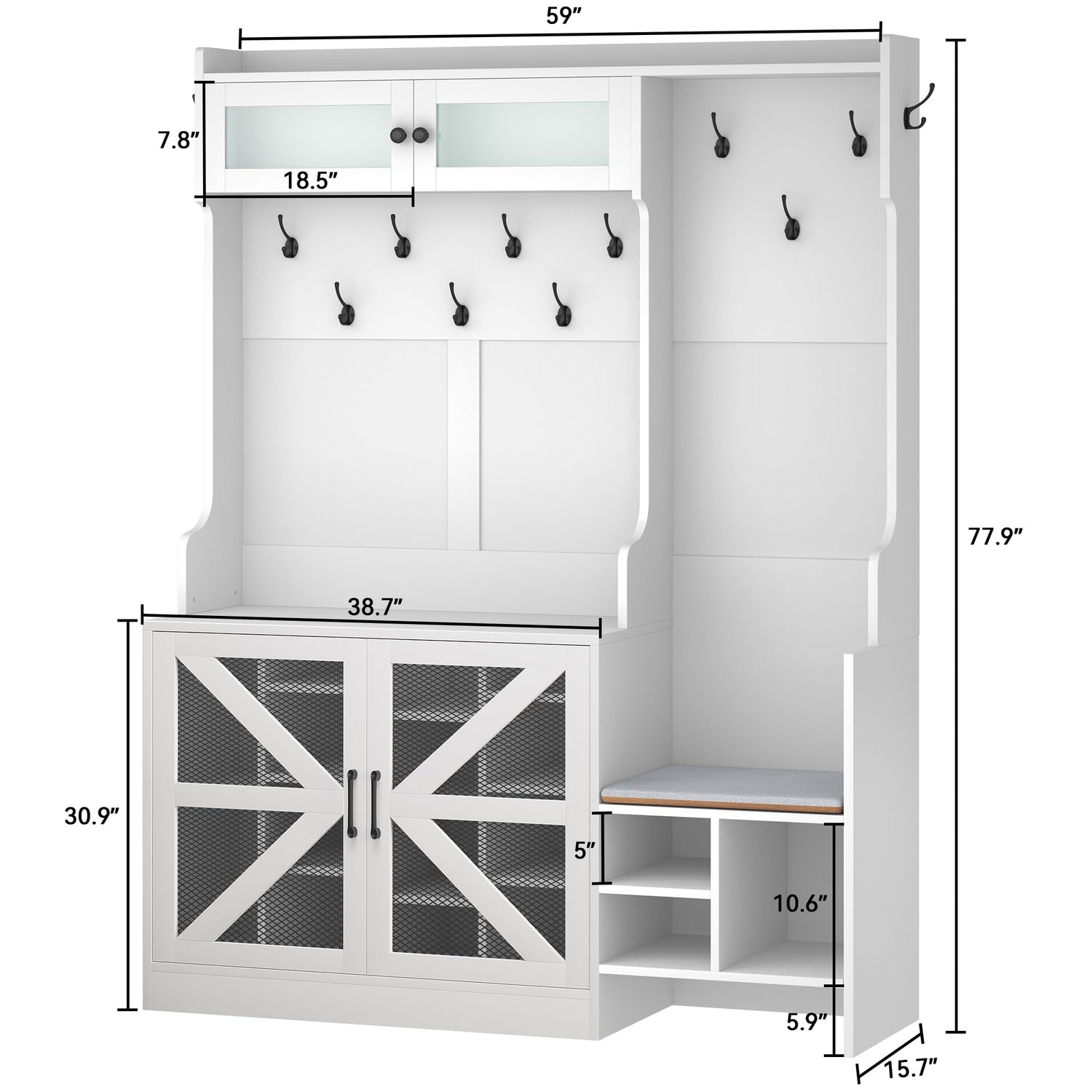 - Room for Everything: Featuring 18 shoe cubbies, a 12-hook coat rack, an upholstered storage bench, and open top shelves, this hall tree keeps your entryway clutter-free and well-organized