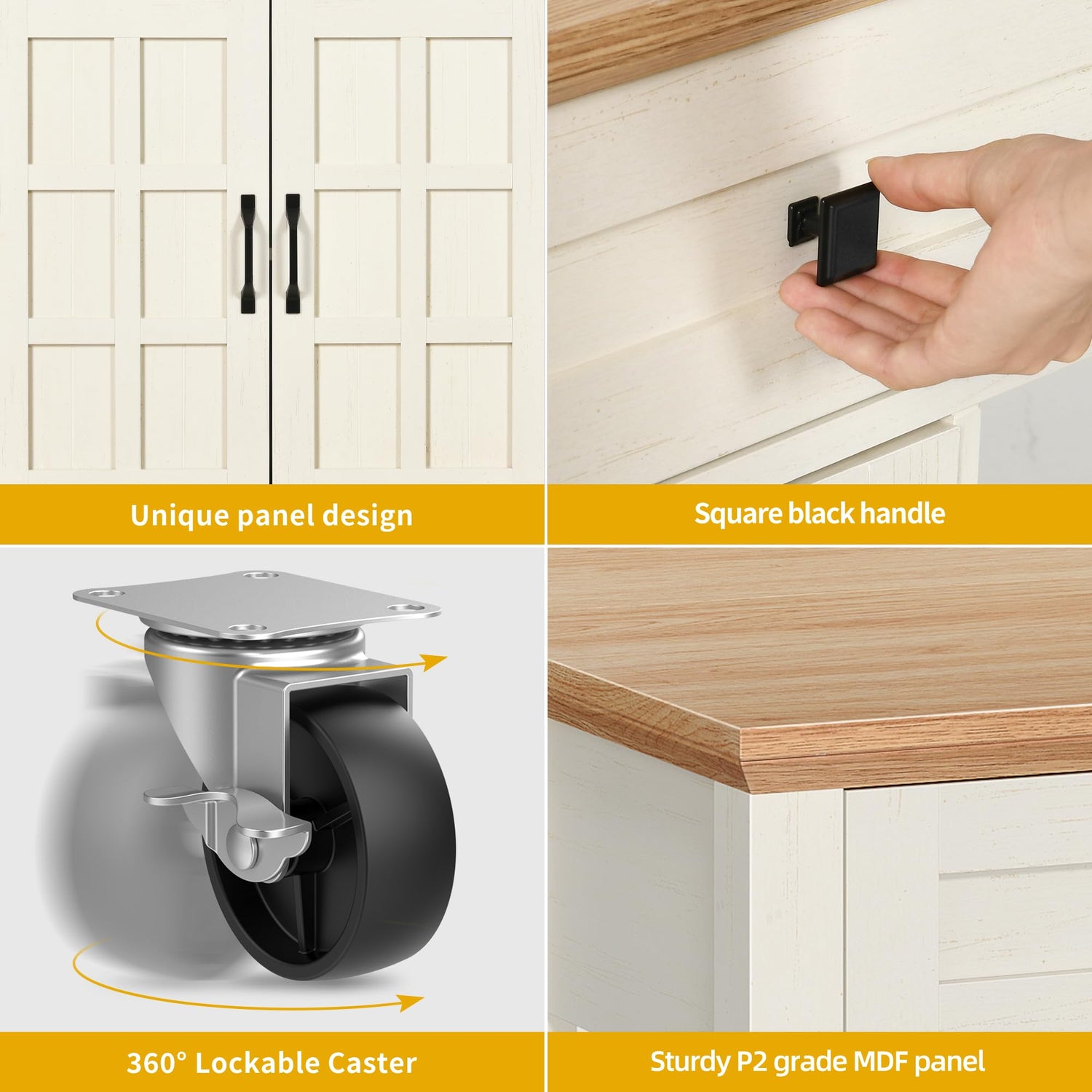 DWVO Kitchen Island with Storage Cabinet, Farmhouse Rolling Island Table on Wheels, Americana Mobile Storage Islands with Open Shelves, Drawers for Living Room, Dining Room, Off White