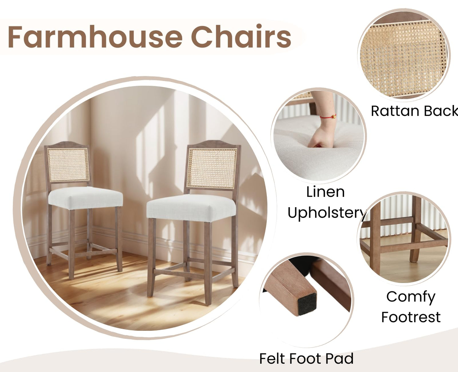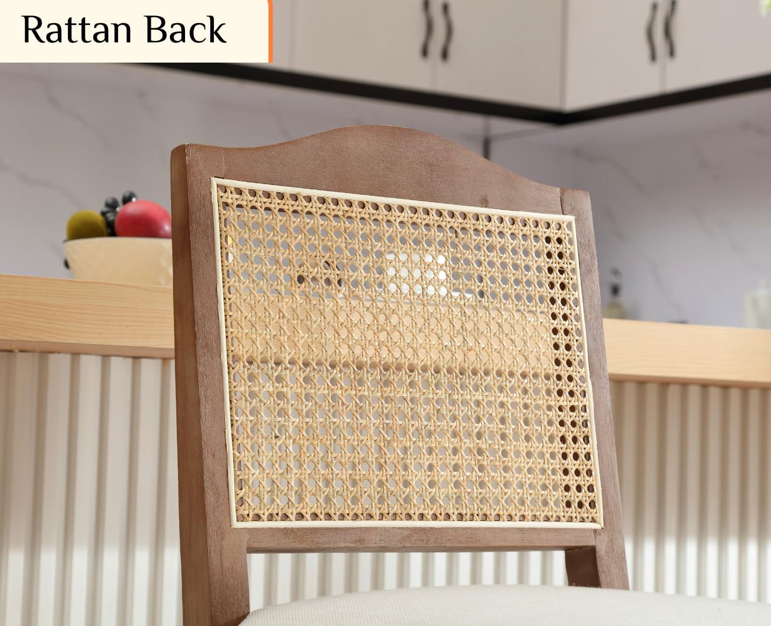 EALSON Counter Height Bar Stools Set of 4 Farmhouse Barstools with Rattan Back Comfortable Upholstered Bar Chairs Mid Century Wood Breakfast Counter Stools for Kitchen Island, Linen Beige