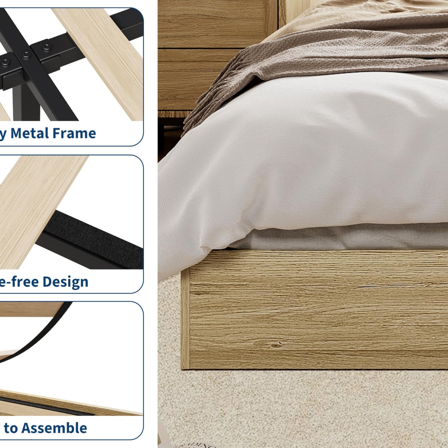 - --Reliable Support: Designed with a durable metal frame and sturdy wooden slats, this wooden bed frame provides excellent mattress support without the need for a box spring. Its robust construction ensures long-lasting stability and comfort for daily use