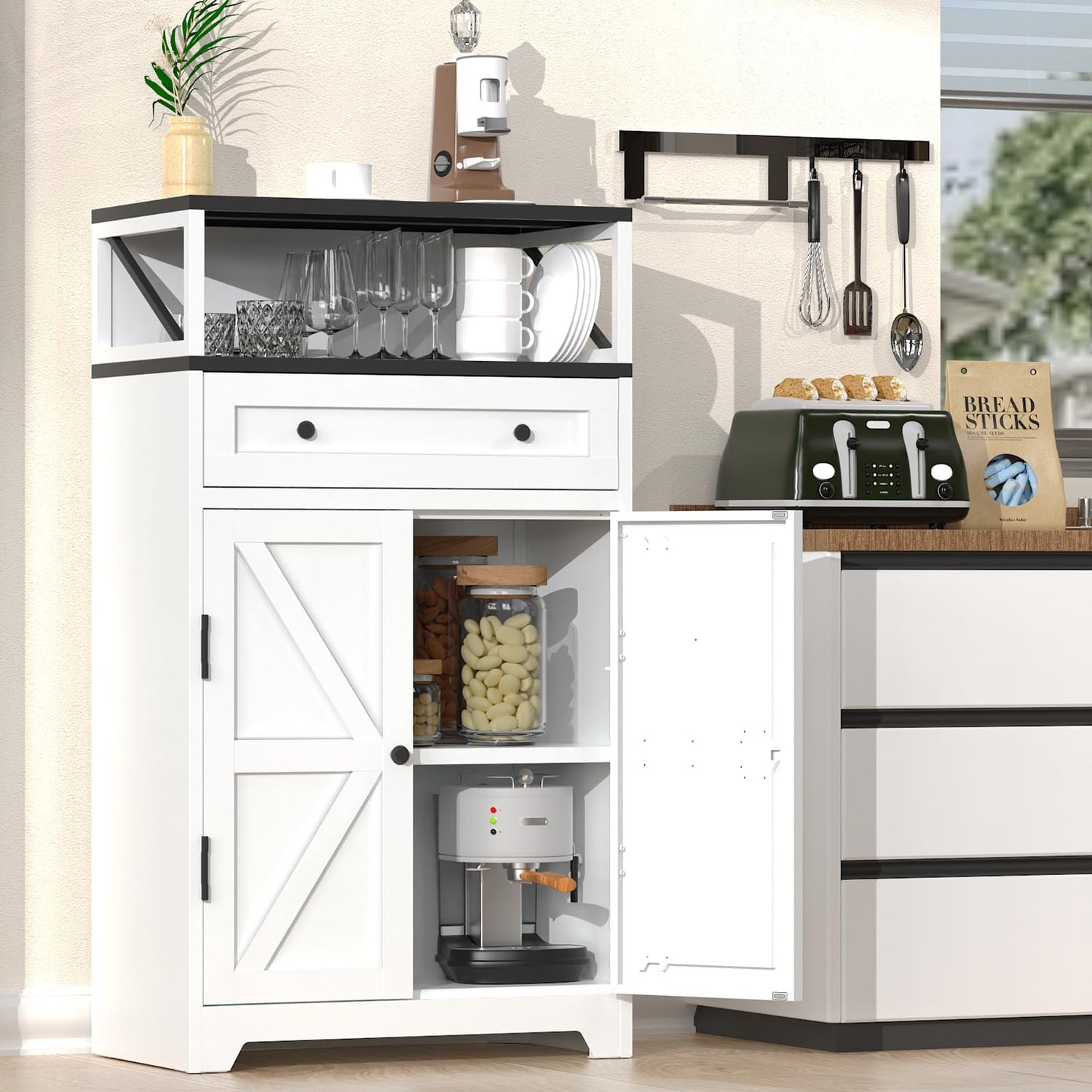 • Industrial Farmhouse & Modern Functionality:Eltean buffets & sideboards features a metal frame black and white color scheme that combines vintage elegance and industrial style, blending rustic charm with modern durability. The open top holds a coffee maker, three tier of storage include a deep drawer with smooth tracks for utensils/private items, and a magnetic door base cabinet for secure storage of bulk items.