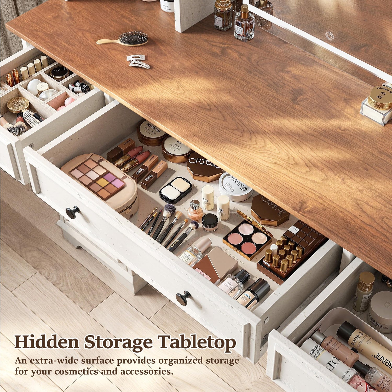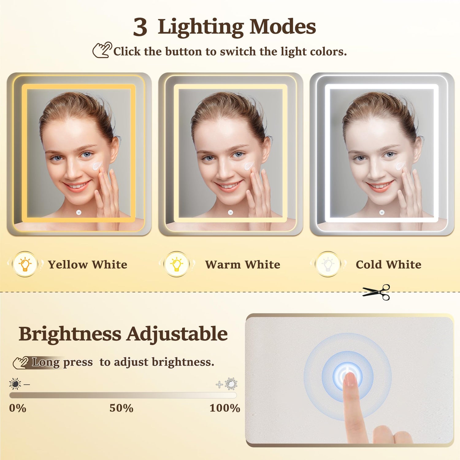 - 【Vanity Mirror with Lights】EnHomee LED vanity desk features three lighting modes: warm light, natural light, and cold light, with brightness adjustable via smart touch control. The vanity creates pretty lighting for users at different times of the day, helping achieve a flawless professional makeup look and a amazing beauty experience, infusing daily care with a sense of luxurious ritual.