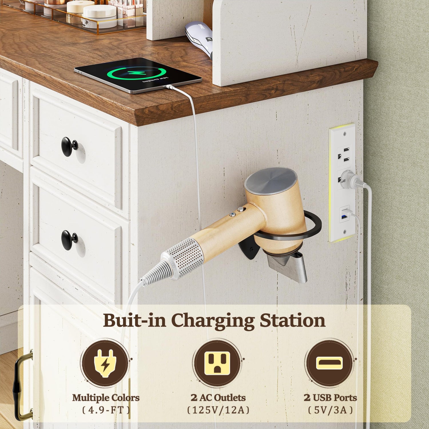 - 【Convenient Charging Station and Hairdryer Rack】This farmhouse vanity features handy charging ports and outlets to power devices, plus a dedicated holder for hair dryers, curlers, etc. This white vanity's functionality lets you style and skincare efficiently without moving—turning routines into delightful multi-purpose beauty rituals.