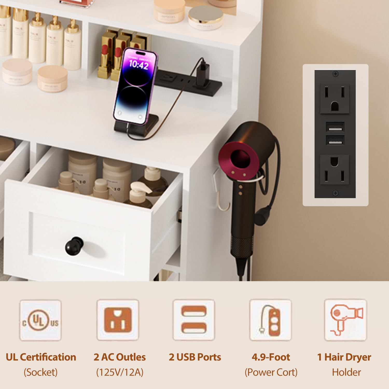• 【ILLUMINATED DESIGN】Features LED mirror with 3 lighting modes and convenient built-in power outlet for charging devices while doing makeup