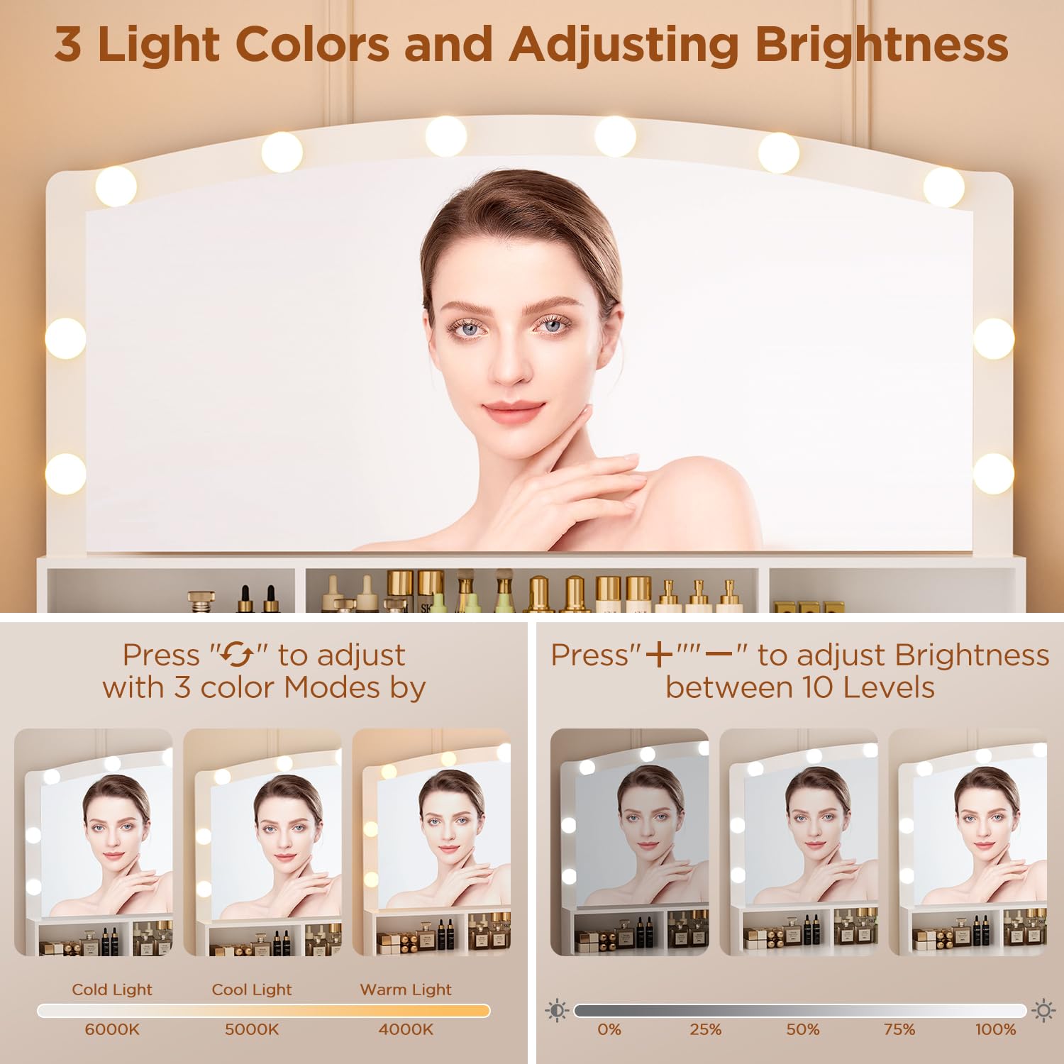 ERLEJIA Farmhouse Vanity Desk with Mirror and Lights&Stool and Power Outlet, 43.3" Large 3 LED Lights Modes Makeup Vanity Table with 7 Drawers, 2 Cabinets& Large Mirror,Bedroom Vanity Desk White