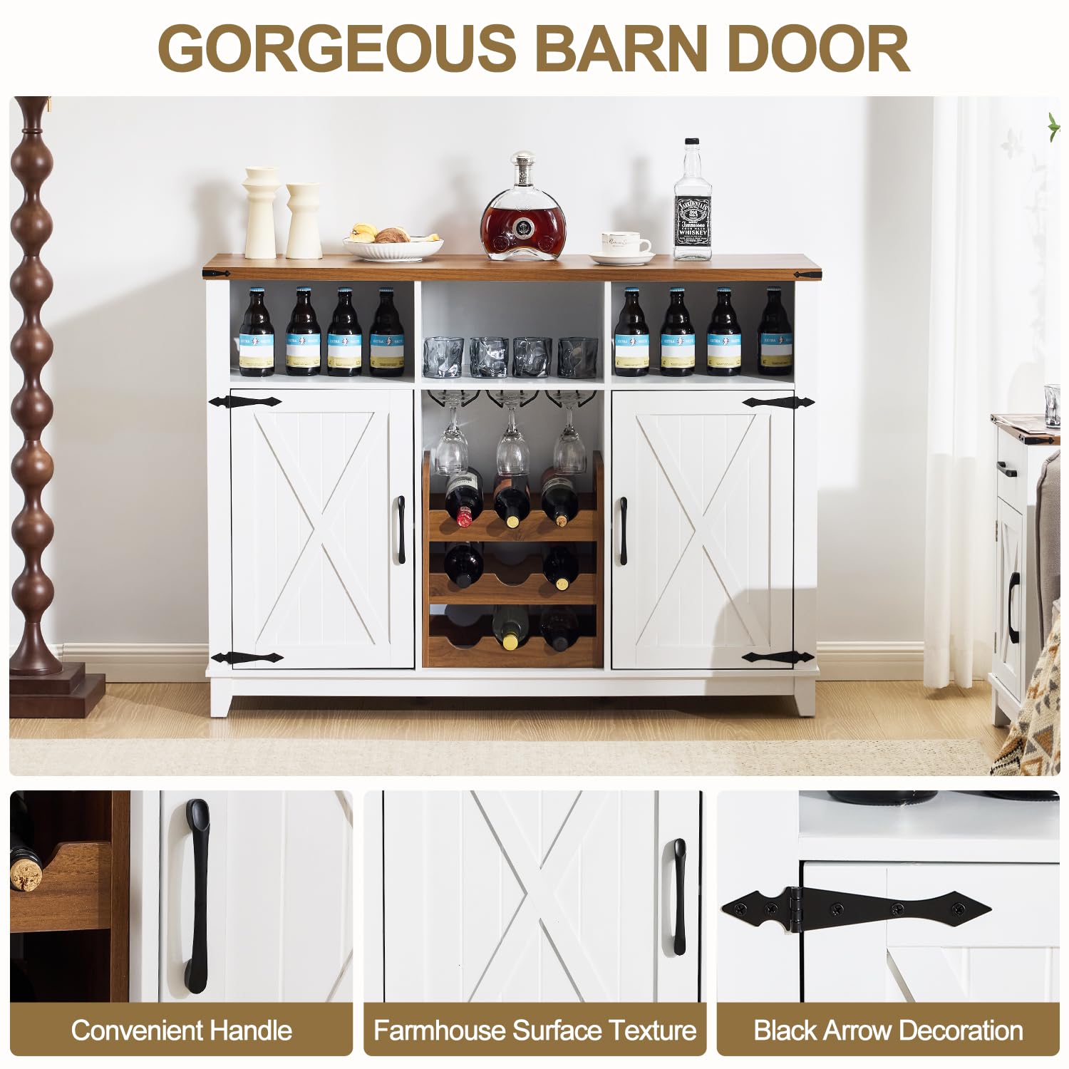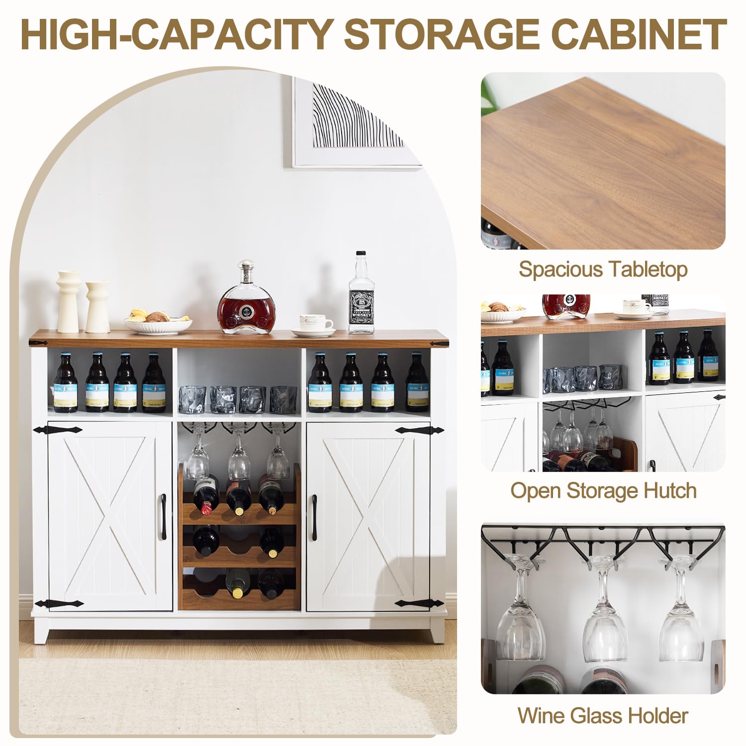 EROMMY Farmhouse Wine Bar Cabinet, 51" Sideboard Buffet Cabinet with Detachable Wine Rack and 3 Open Storage Compartments, Rustic Liquor Cabinet for Dining, Living Room, Kitchen, White