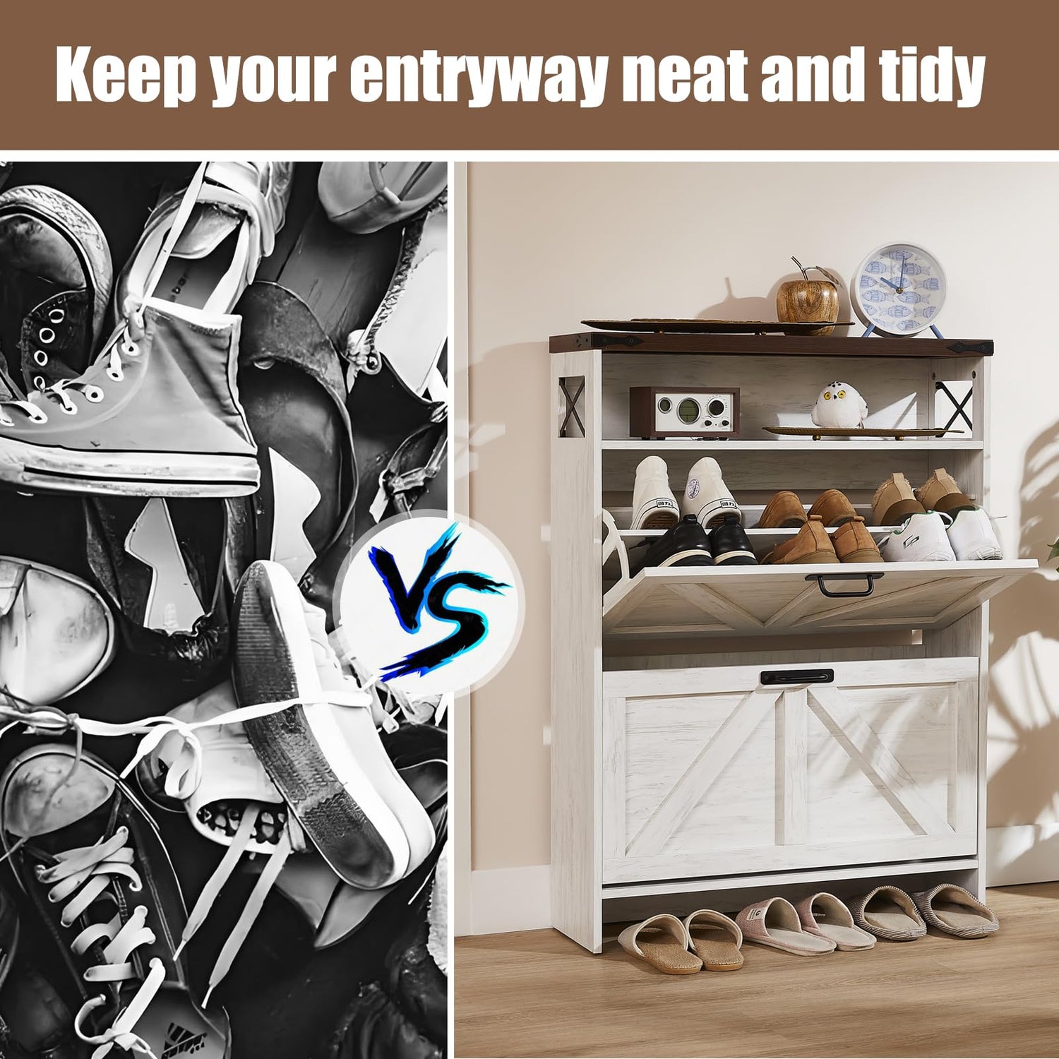 • FARMHOUSE STYLE DESIGN: The shoe storage organizer cabinet features a classic farmhouse style color scheme with a unique “x” design on the side, making the shoe cabinet adaptable to any style of interior decor. Perfect for entryways, hallways, living rooms or porches, the shoe storage cabinet gives your home a clean and tidy look while saving space.