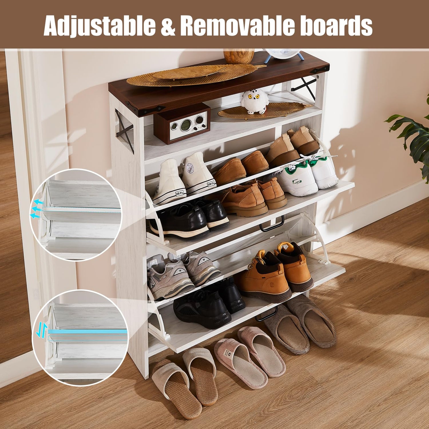 • 2 HIDDEN FLIP-UP DRAWERS: The shoe storage organizer cabinet has two hidden drawers and two shoe shelves inside the drawers, which can hold a large number of shoes. It doesn't look like a shoe cabinet at all, but when you pull out the drawers, you will be shocked by the amount of shoe space it contains. Compared to ordinary shoe cabinets, it can save space while being able to put down more shoes.