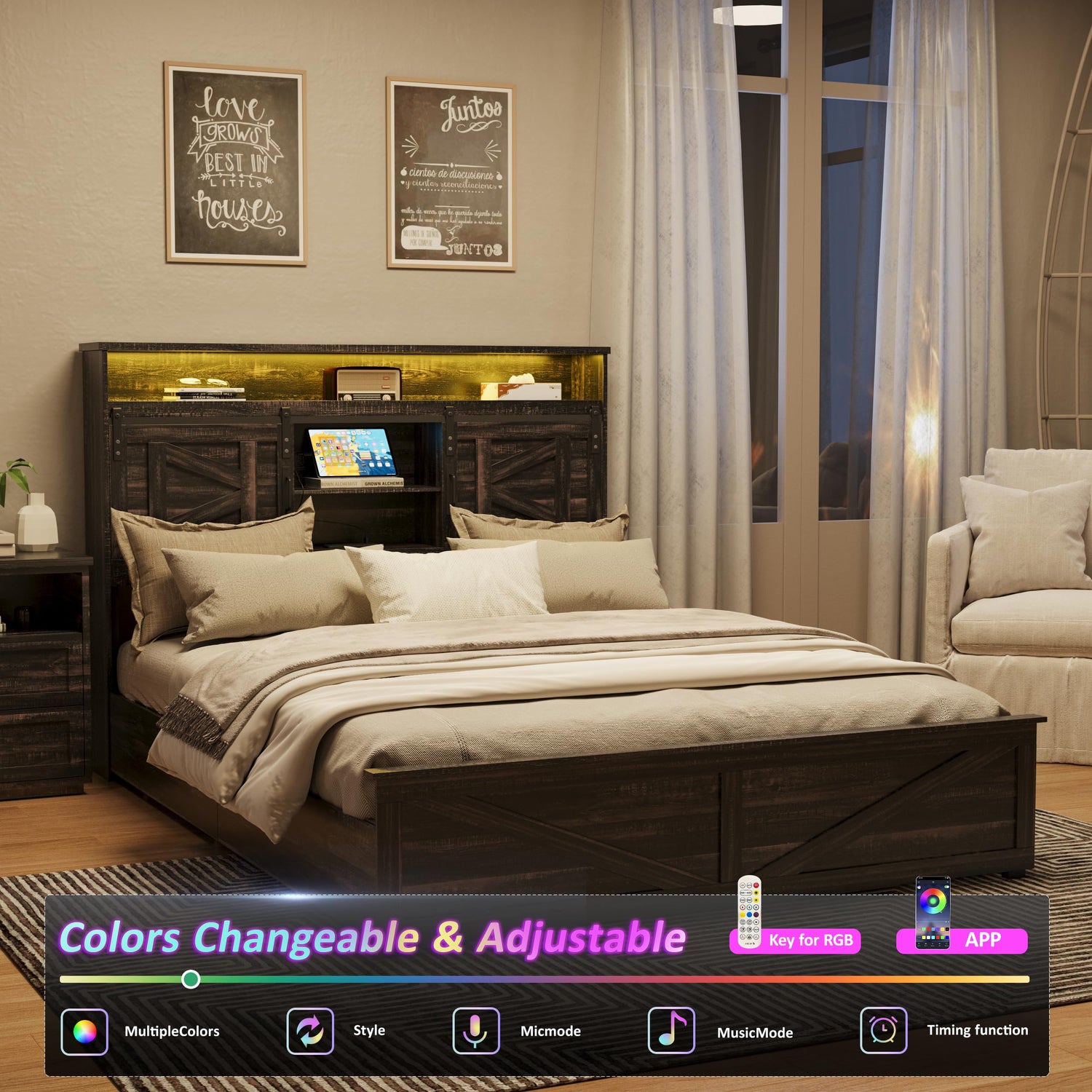 Fameill Farmhouse Full Size Bed Frame with 4 Drawers, Bookcase Headboard, LED Lights, Charging Station & Sliding Barn Door Shelves in Dark Rustic Oak
