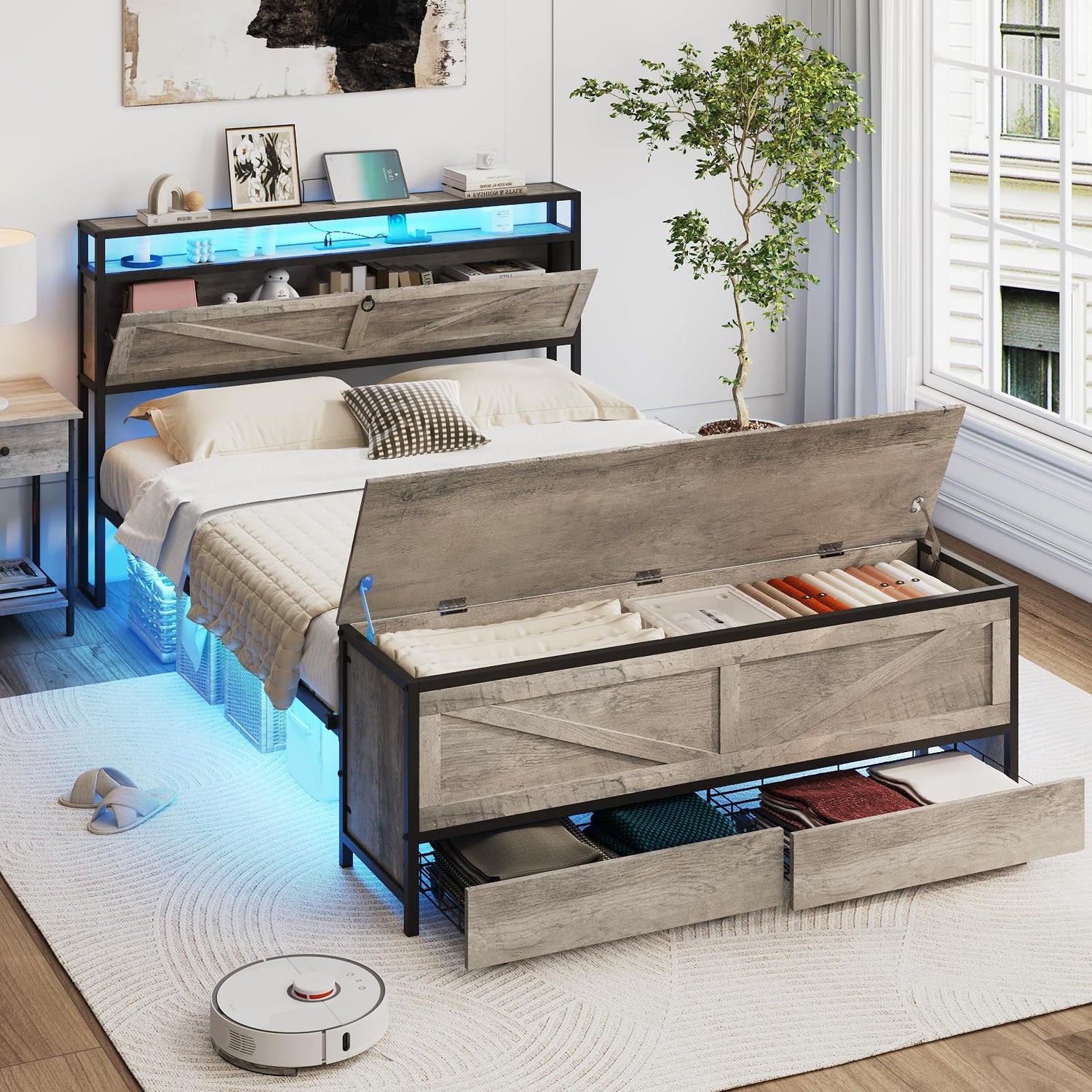 Fameill Queen Size Bed Frame with Storage Ottoman and 2 Drawers, Farmhouse Metal Platform Bed with Headboard, LED Lights and Charging Station, No Box Spring Needed, Noise Free, Gray
