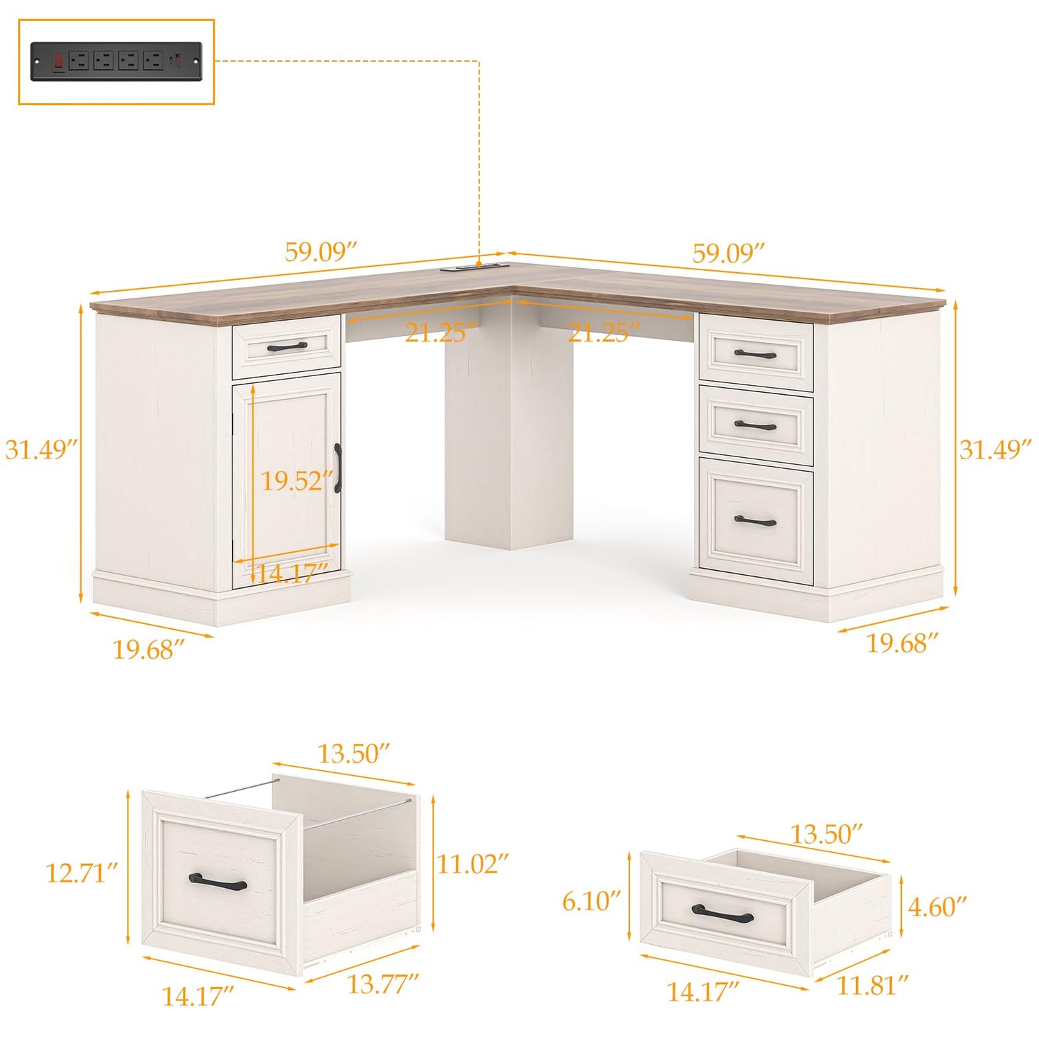 Farmhouse 59" L-Shaped Executive Desk with Drawers, Wood Home Office Corner Desk with Charging Station, File Drawer, Storage Cabinet, Rustic Computer Writing Desk for Home Office (Antique White).