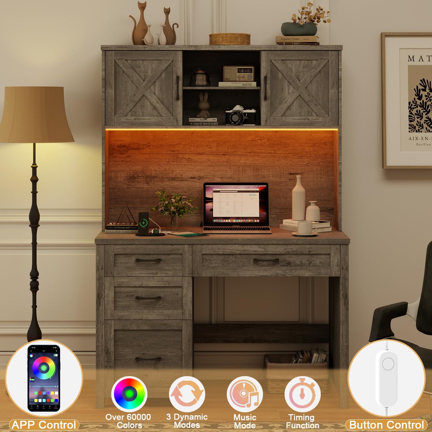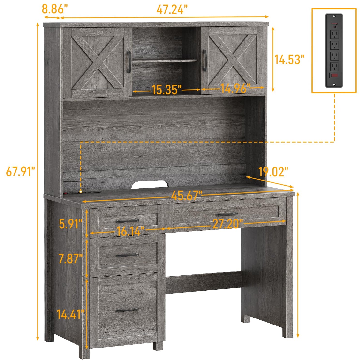 Farmhouse 67" H Executive Desk with Hutch, 4 Drawers and LED Light, Computer Desk with Storage Cabinet & File Drawers and Charging Station, Workstation for Home Office and Study.
