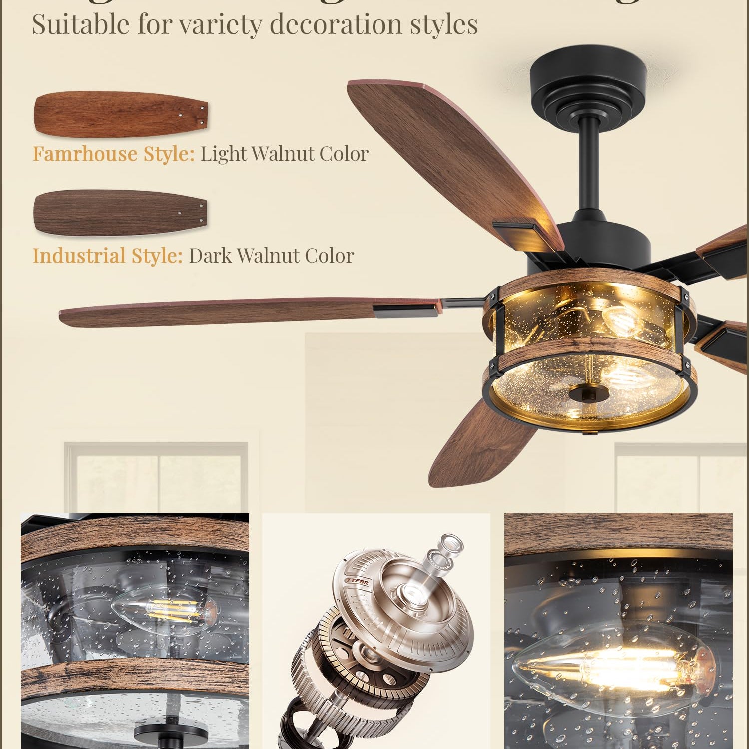 - 52-inch Farmhouse Ceiling Fan: This rustic ceiling fan with light features a glass shade and two-tone blade design, combining stylish modernity with a vintage cage style, adding a touch of elegance and nostalgia to any room. The 3*E12 bulb base allows you to easily customize the lighting (bulbs not included). The unique raindrop glass shade design makes the light brighter and softer, while injecting an industrial rustic charm, making it an ideal choice for indoor bedrooms, living rooms, kitchens