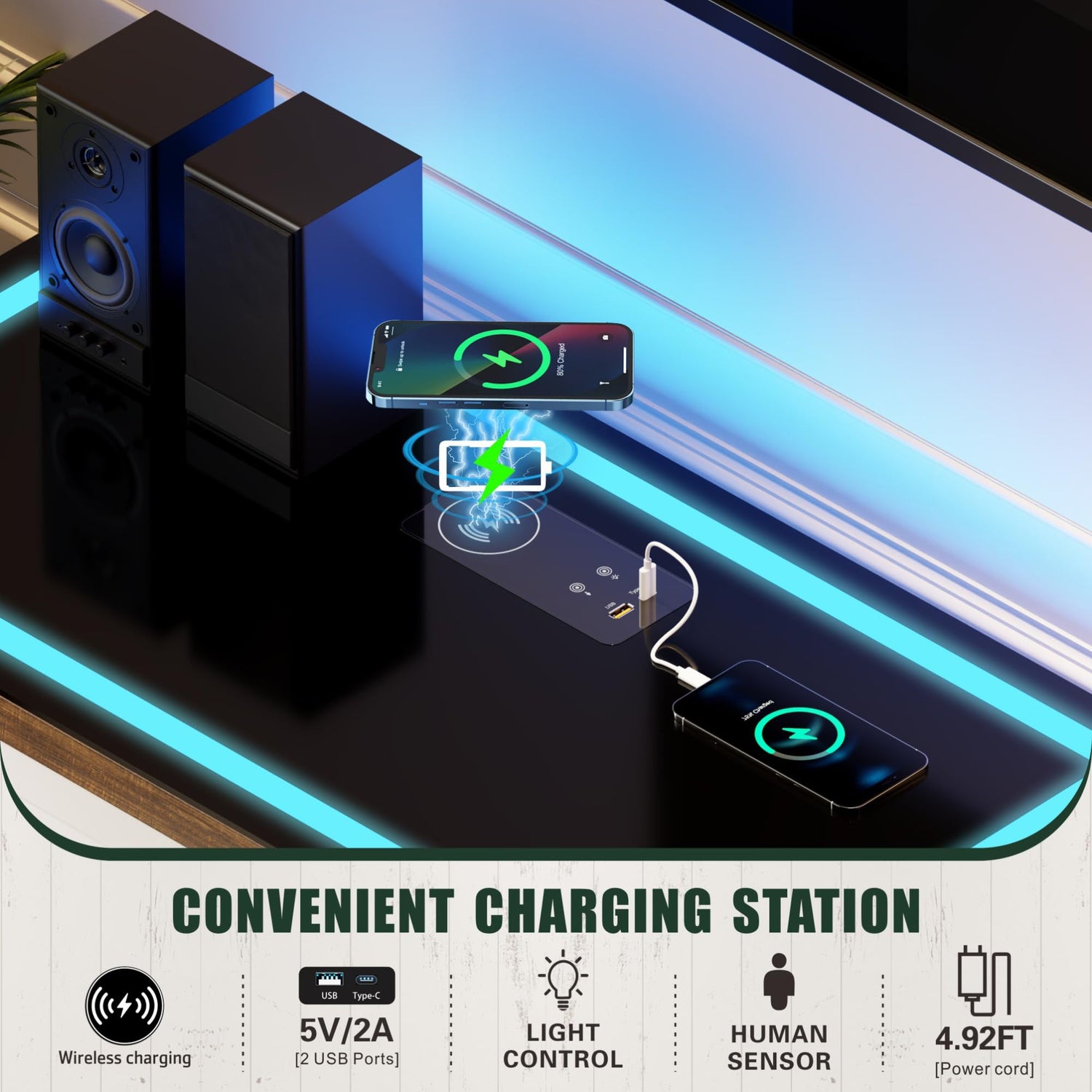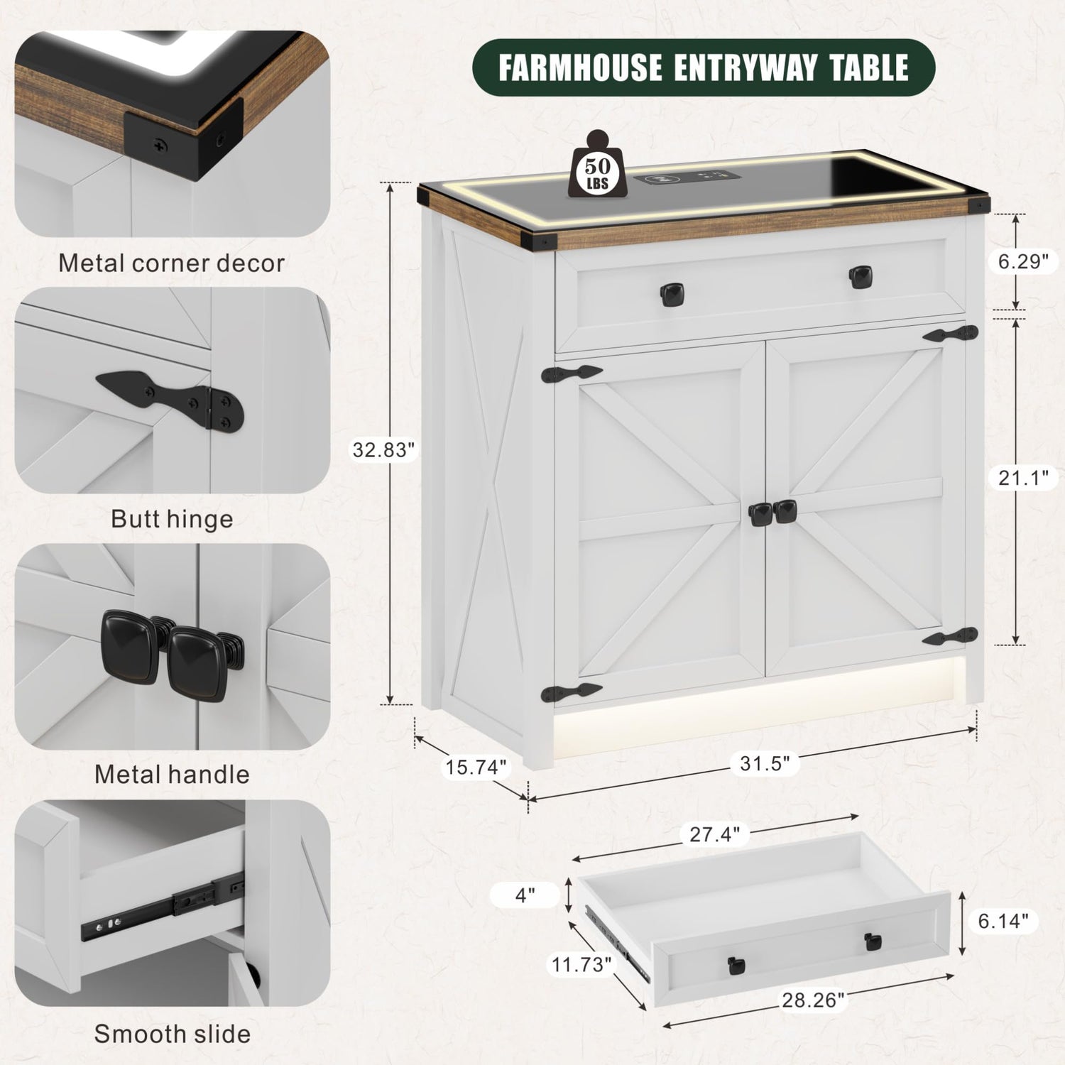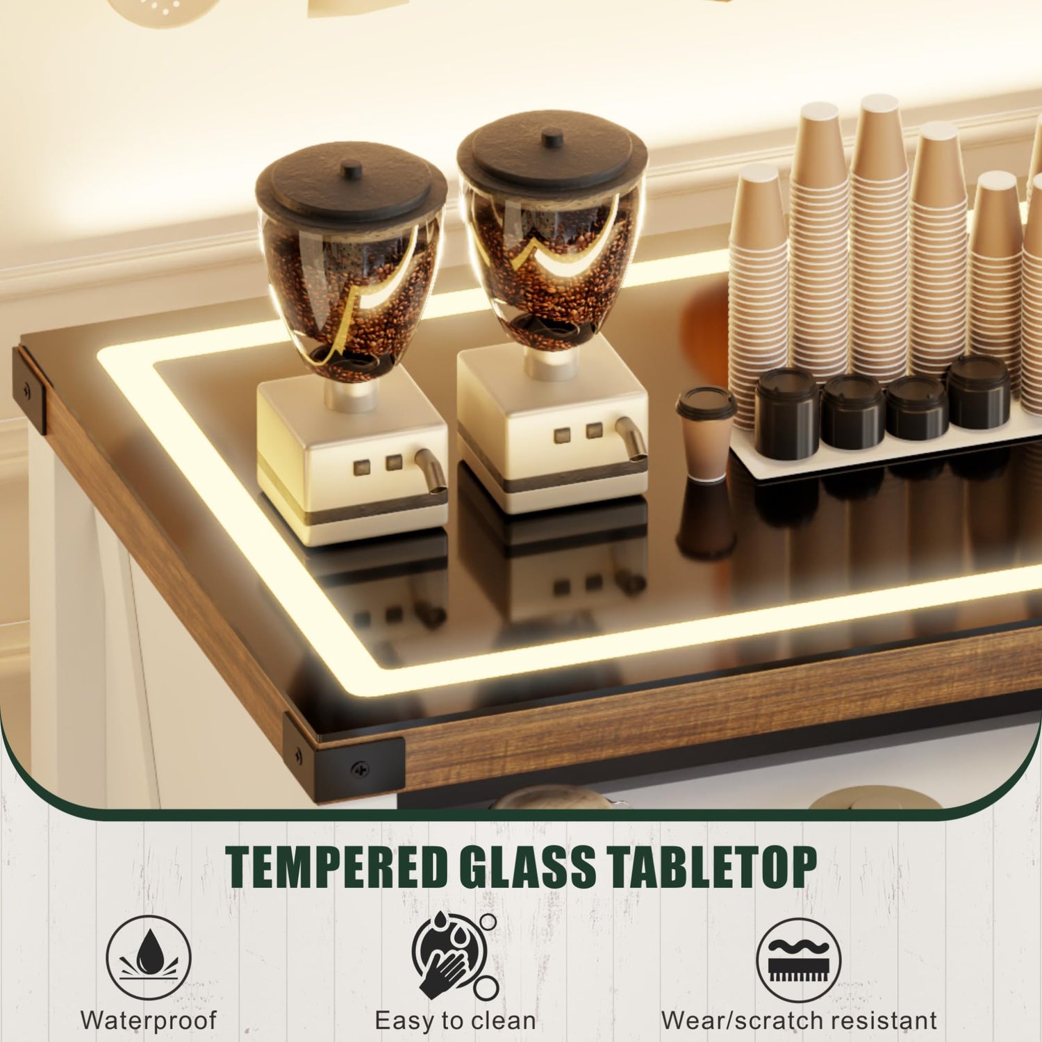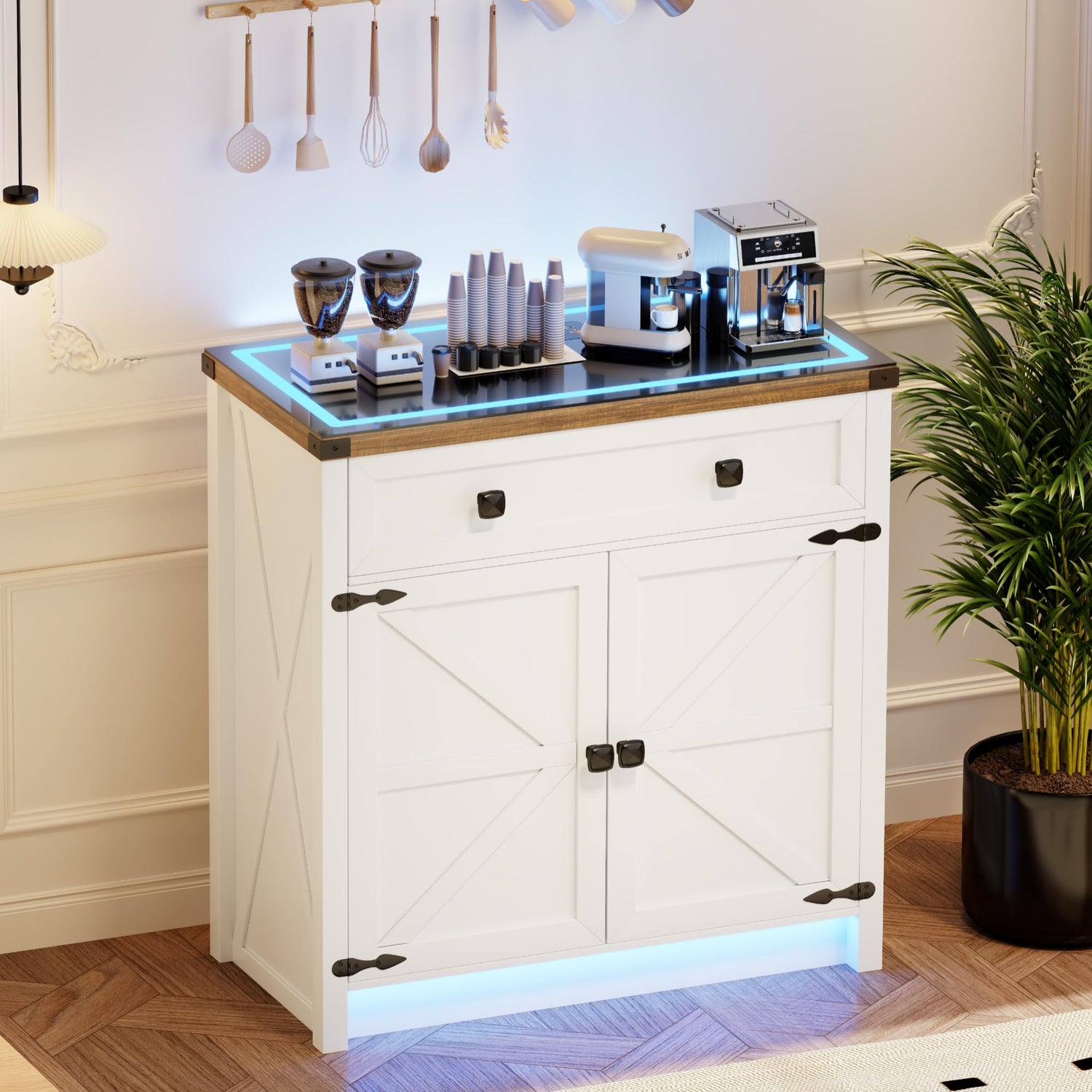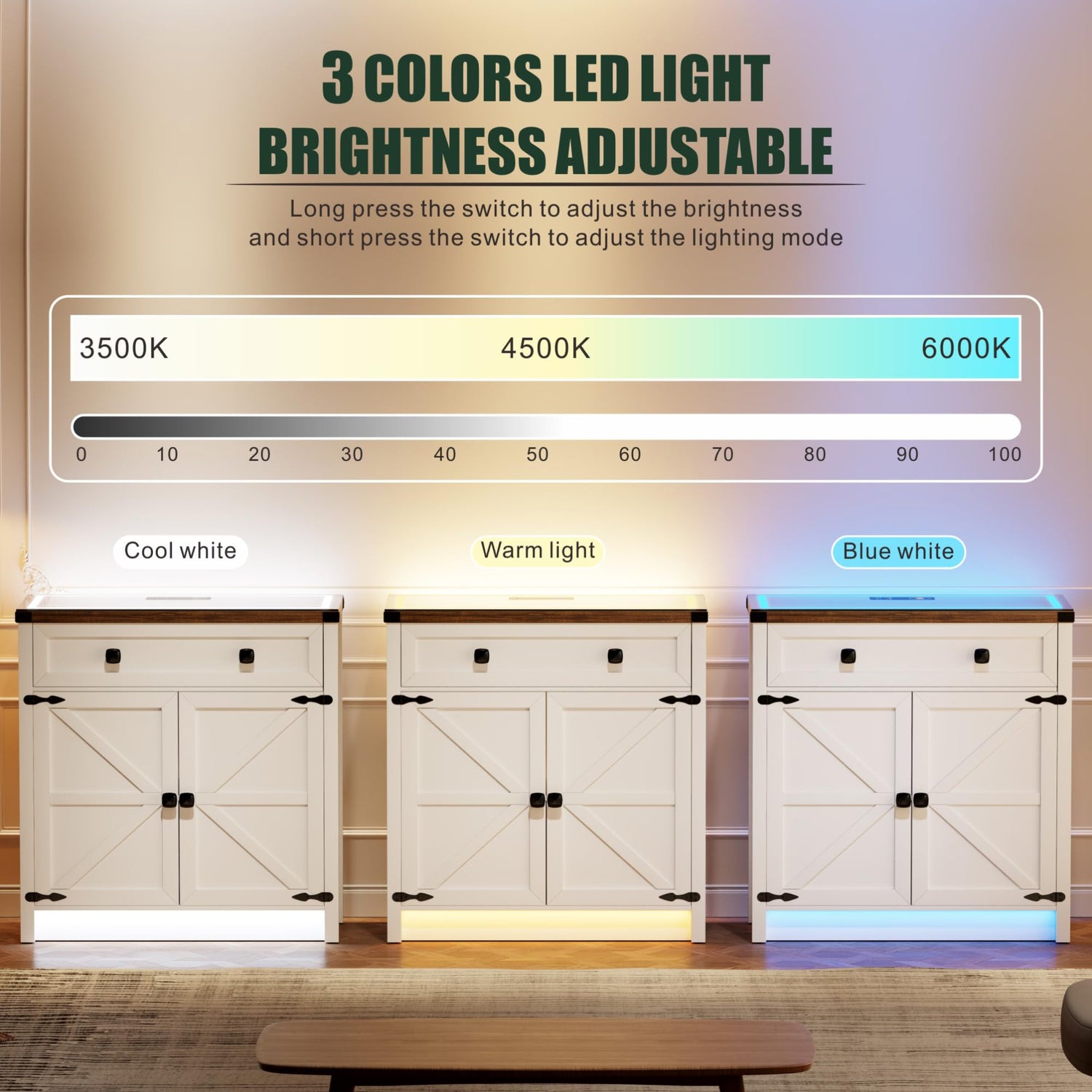 Farmhouse LED Storage Cabinet With Glass TOP,Smart Buffet Sideboard Cabinet with Charging Station,Standing Coffee Bar Cabinet With 2 Doors &Drawer for Bathroom,Kitchen,Living Room,Bedroom,White