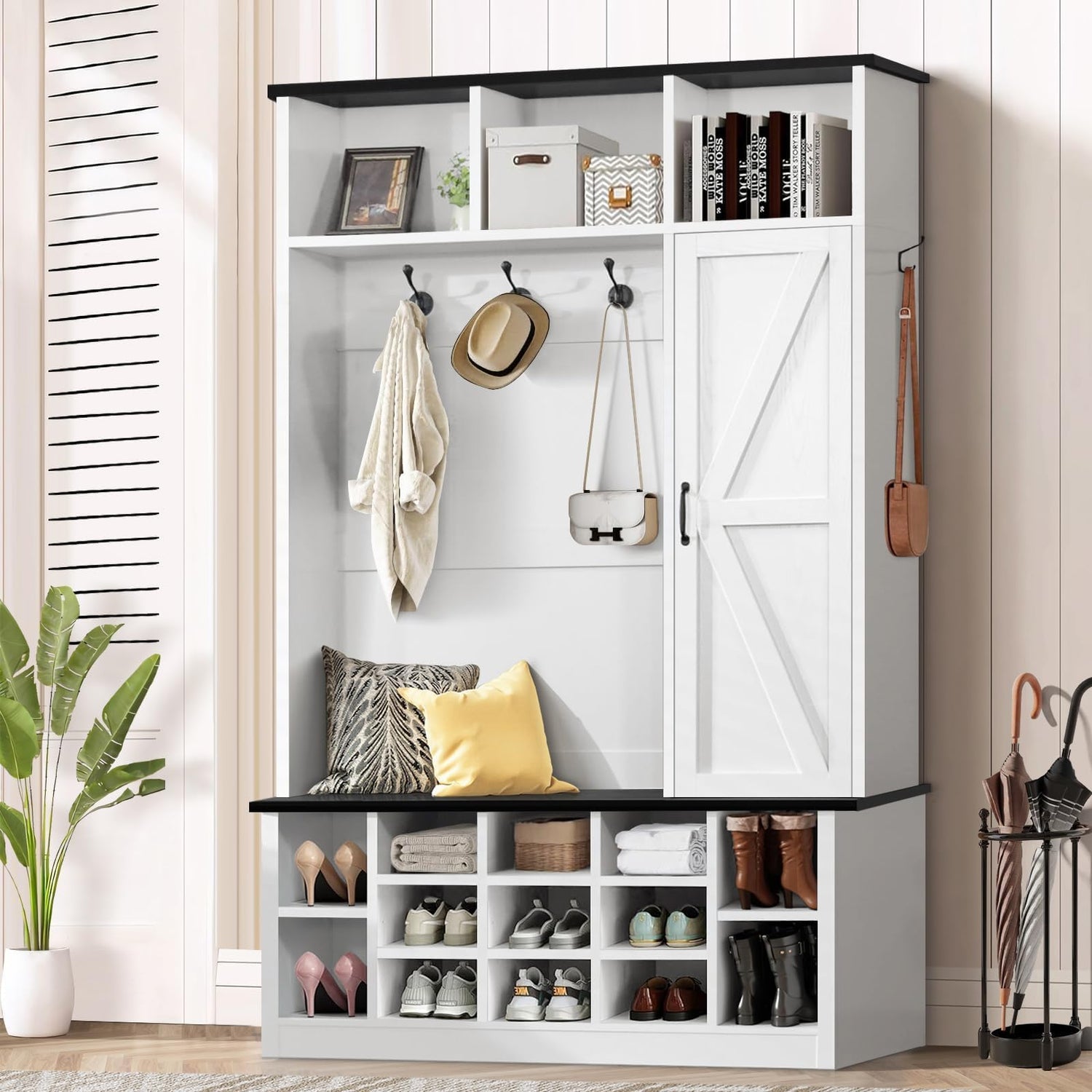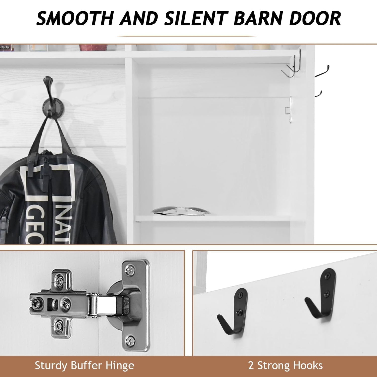 Farmhouse Mudroom Hall Tree with Shoe Storage, 79 Inch Hall Tree with Bench for Entryway, White Entryway Bench with Coat Rack and Barn Door, Adjustable Shoe Cubbies and 3-Tier Cabinet, white