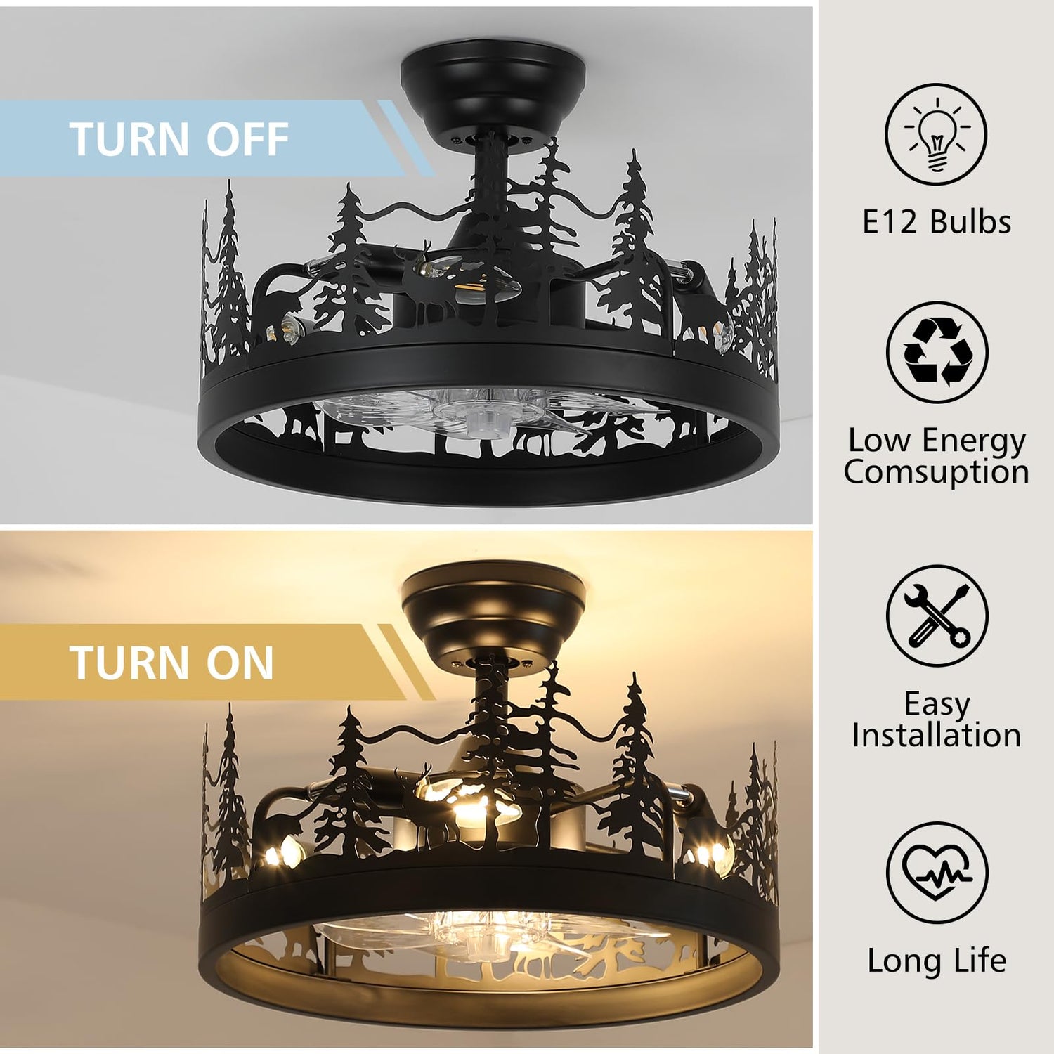 - Wide Applications: The timed off feature allows you to set your black ceiling fan with lights to turn off after 1, 2, or 4 hours, This feature can reduce electricity and reduce energy. The rustic farmhouse chandelier showcases a rustic, black metal finish with a round shape, making it ideal for log cabins, kitchen islands, entryways, bars, bedrooms, and living rooms.