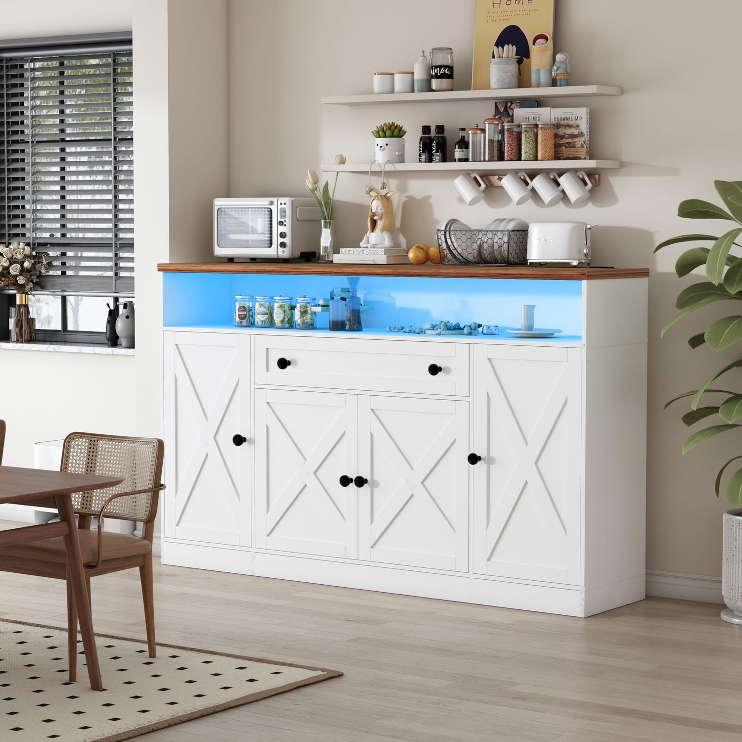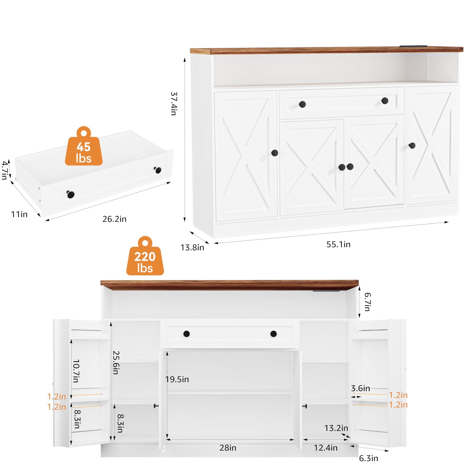 FJTJBSI 55" Buffet Cabinet with Power Outlets and Lights Large Kitchen Sideboard Buffet with Drawers Farmhouse Kitchen Storage Cabinet with Adjustable Shelves Coffee Bar Station for Coffee Bar Room