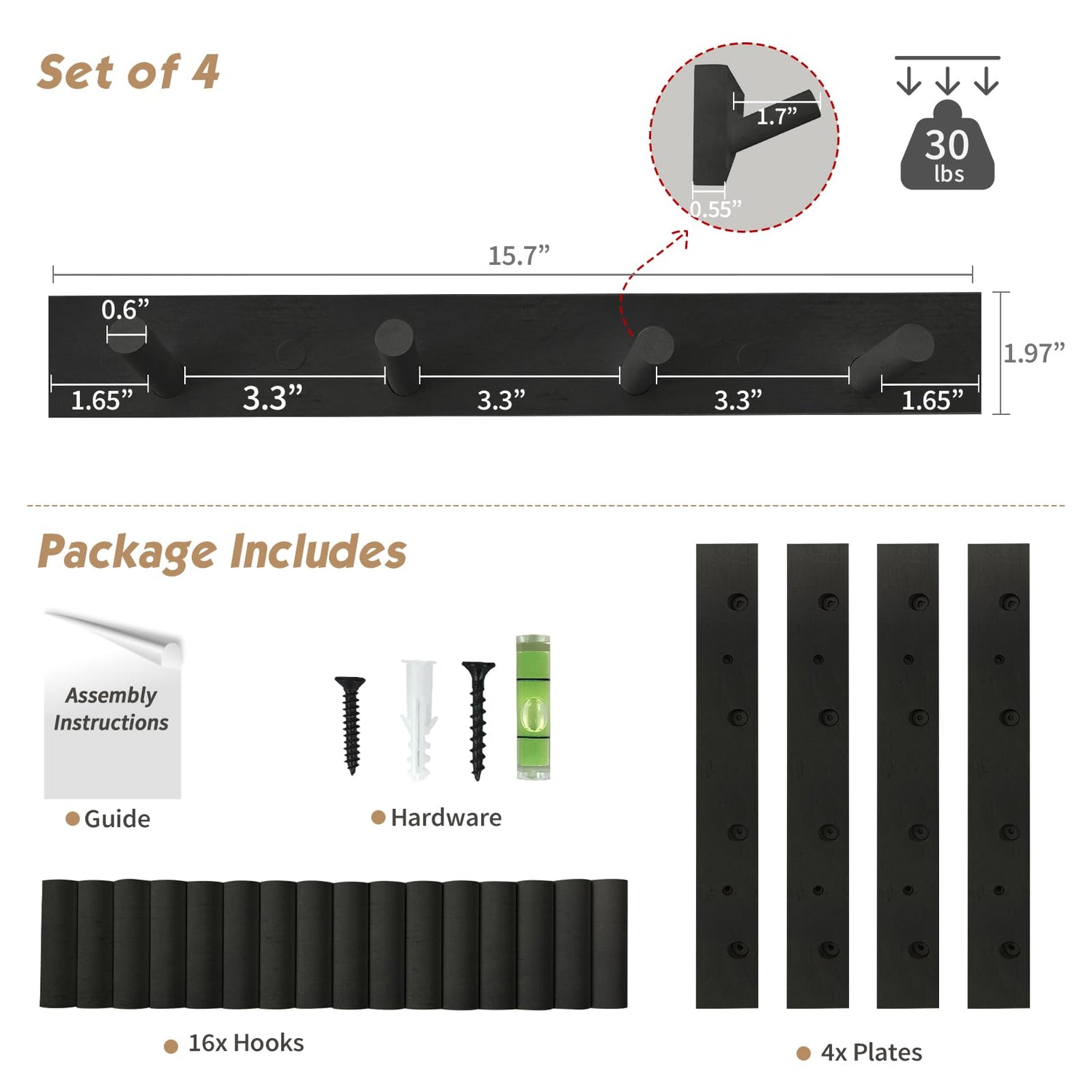 - 【What You Get】4 x wall coat rack with 4 hooks (W 15.7" * D 2.2" * H 2.0") and necessary assemble kit.